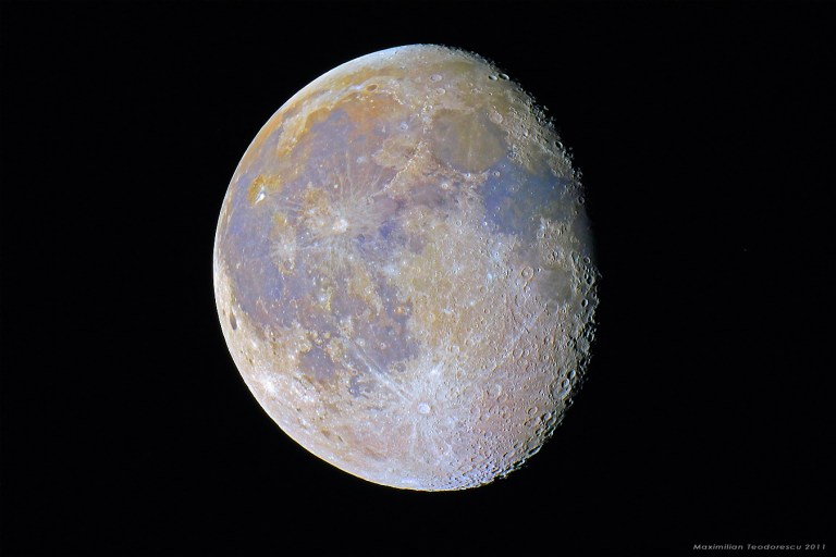A, si culorile din imagine, sunt reale, adica exista aceste nuante la surpafata lunara, insa sunt foarte, foarte, foarte sterse. Eu nu am facut decat sa le amplific extrem. Culorile indica locatii ale diferitor tipuri de roci. Supra-saturarea nu se poate face corect decat pe imagini realizate cu un instrument care foloseste principiul reflexiei, deci nu cu un mediu transparent prin care trece lumina; cu alte cuvinte cu un telescop se pot face astfel de imagini (fie el si Mak, SC) pe cand printr-o luneta (chiar ED, ori asa zisele apo-cromate mai ieftine) culorile sufera aberatii cromatice importante care ies foarte usor in evidenta la suprasaturare. Nu am vazut inca imagini de genul asta realizate cu un apocromat Zeiss ori altele din aceasta clasa, care sunt foarte bine corectate cromatic; poate la acest tip de refractor aberatia cromatica sa fie atat de buna incat sa permita realizarea de imagini “suprasaturabile”.