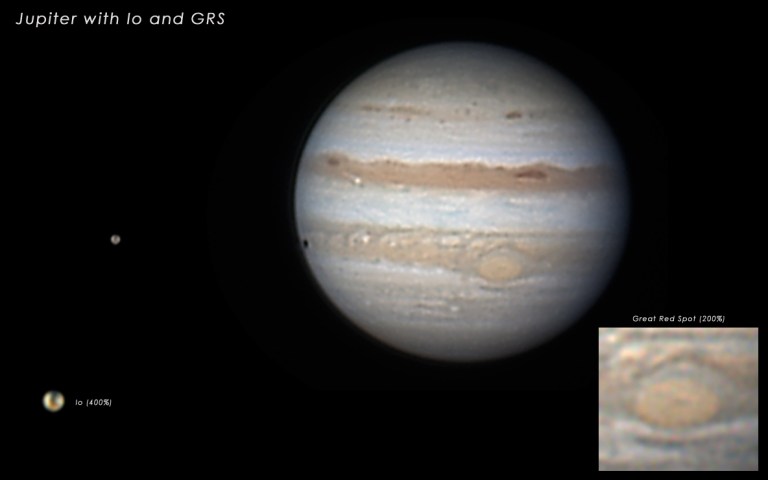 Si mai jos o imagine cu detalii ale satelitului Io si ale Marei Pete Rosii (GRS).