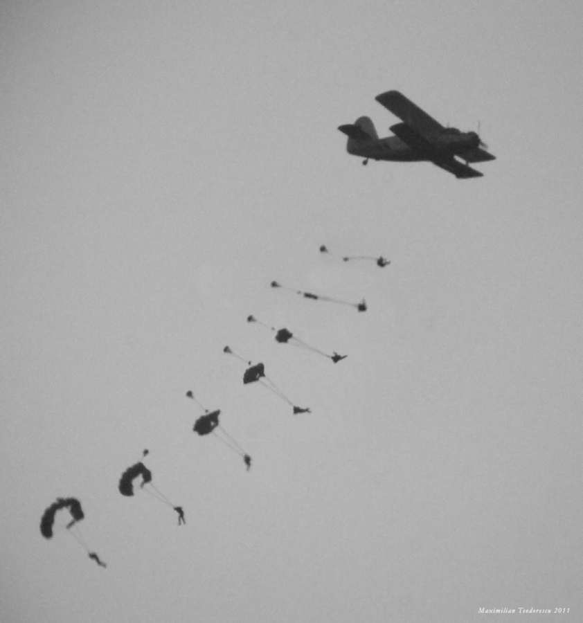 Si o imagine realizata din suprapunerea pozitiilor parasutistului din animatia de mai sus peste o singura imagine de referinta a avionului.
