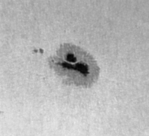 Pe la pranz, intr-o pauza de masa am incercat micul mak de 90mm impreuna cu un barlow 2x si camera DBK 41AU02.AS plus filtru Baader IR pass, pe marea pata solara 1289. Rezultatul, in ciuda numarului mic de cadre (1200) si al seeingului nu tocmai perfect, e suficient de bun pentru a mai…incerca si alta data :). Se observa si granulatia cat de cat dar si riftul de separare al nucleului.