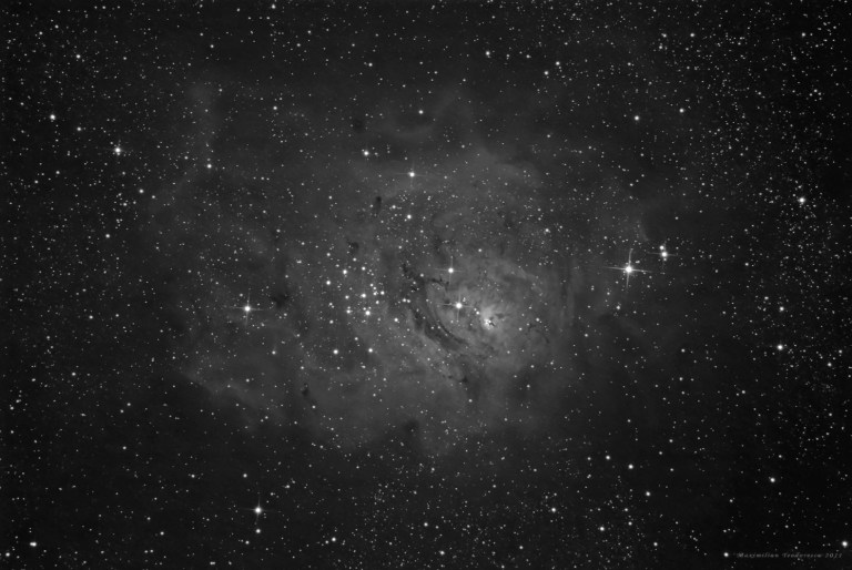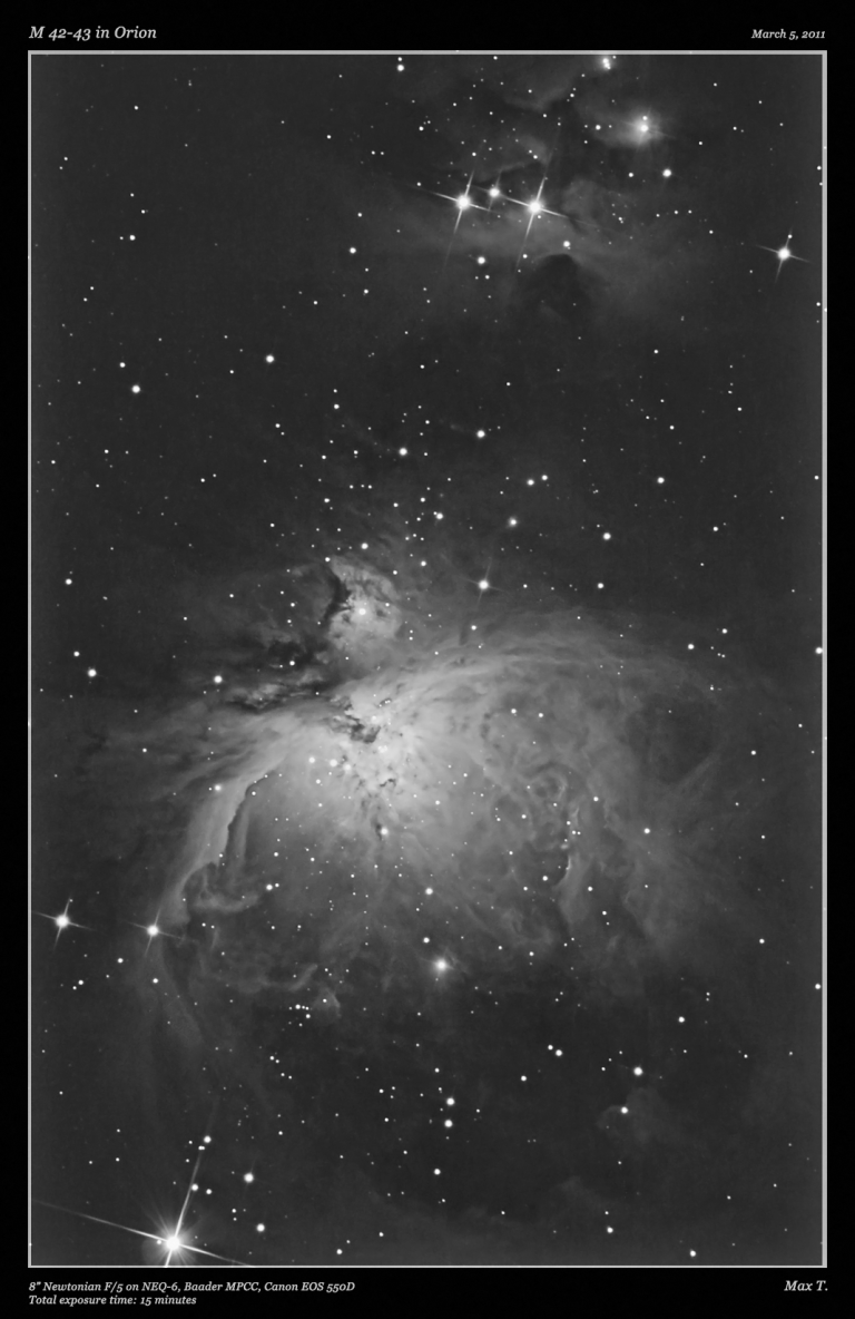 Si ultima imagine, o reprocesare a celei mai bune fotografii personale cu Nebuloasa din Orion, tot in varianta alb-negru, pentru ca nu mi-au placut culorile finale. Detaliile tehnice sunt trecute pe fotografie; imaginea e realizata din locatia mea “normala”, si anume Dumitrana, Ilfov, pe un cer de +5.8. E un rezultat bun zic eu, tinand cont atat de cer cat si de timpul de expunere.