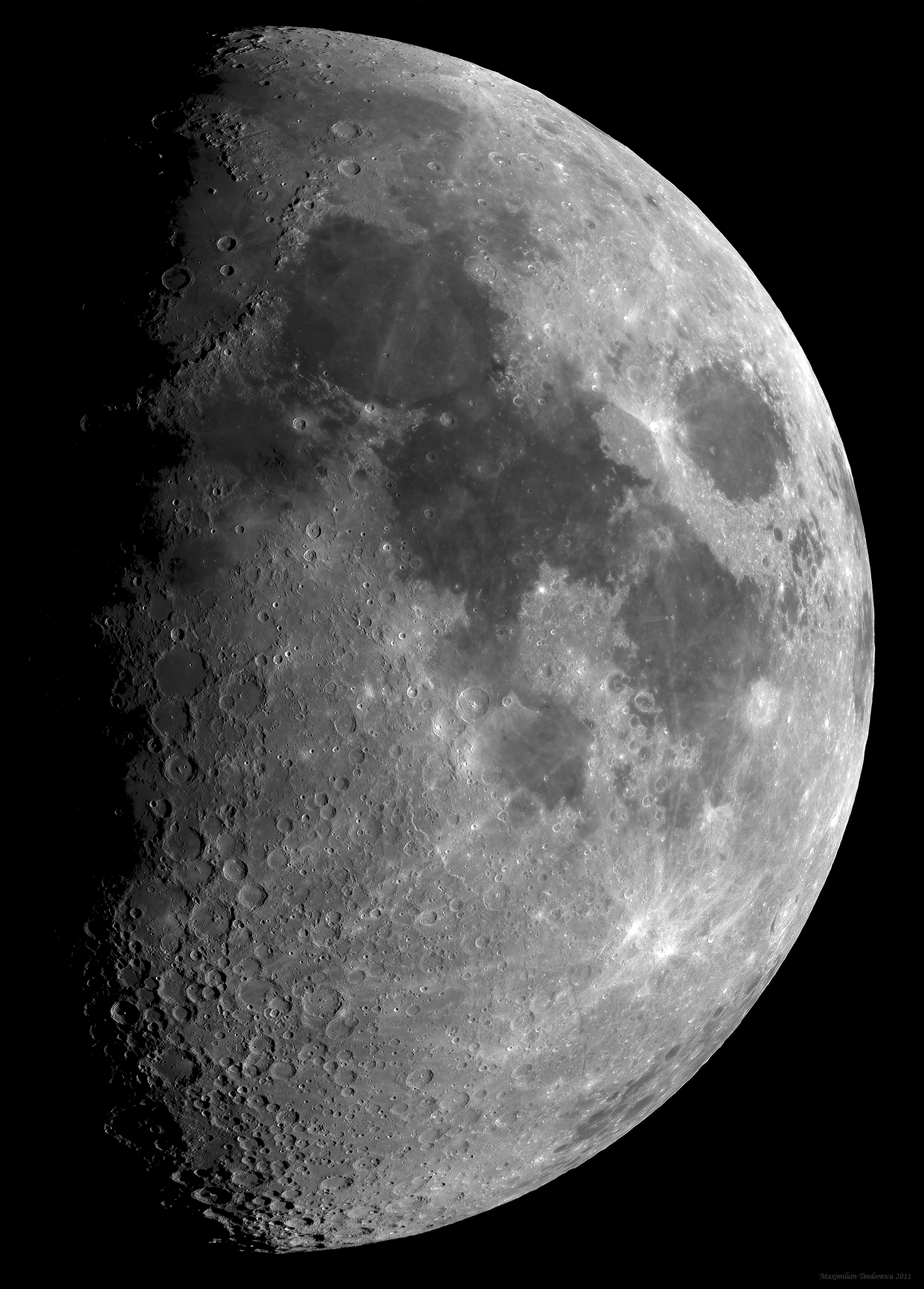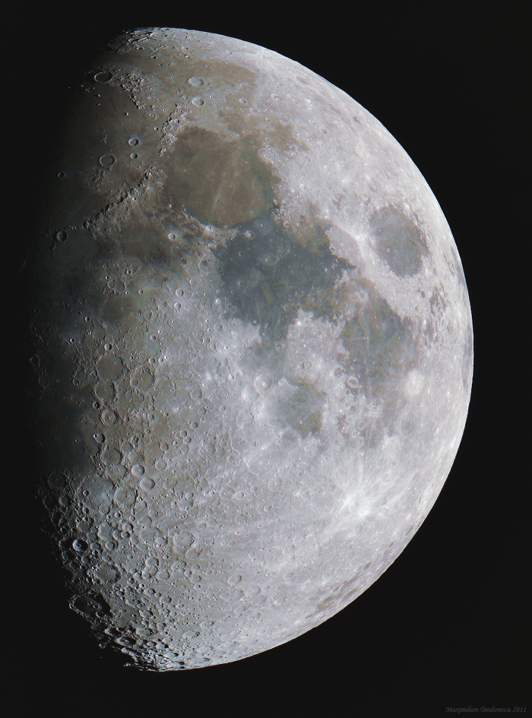 Am reusit sa combin informatia de culoare cu cea de detaliu din cele doua imagini de mai sus, rezultatul fiind o fotografie care prezinta Luna asa cum am putea-o observa printr-un telescop daca am avea o sensibilitatea putin mai mare la culoare (un “Increased Saturation Retina” π ).