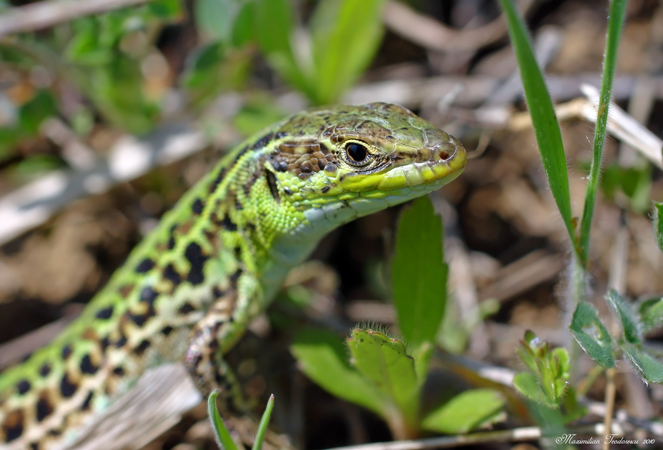 Prin iarba, chiar din locul de unde e realizata imaginea de mai sus, o soparla (Podarcis taurica) admira impreuna cu mine peisajul: