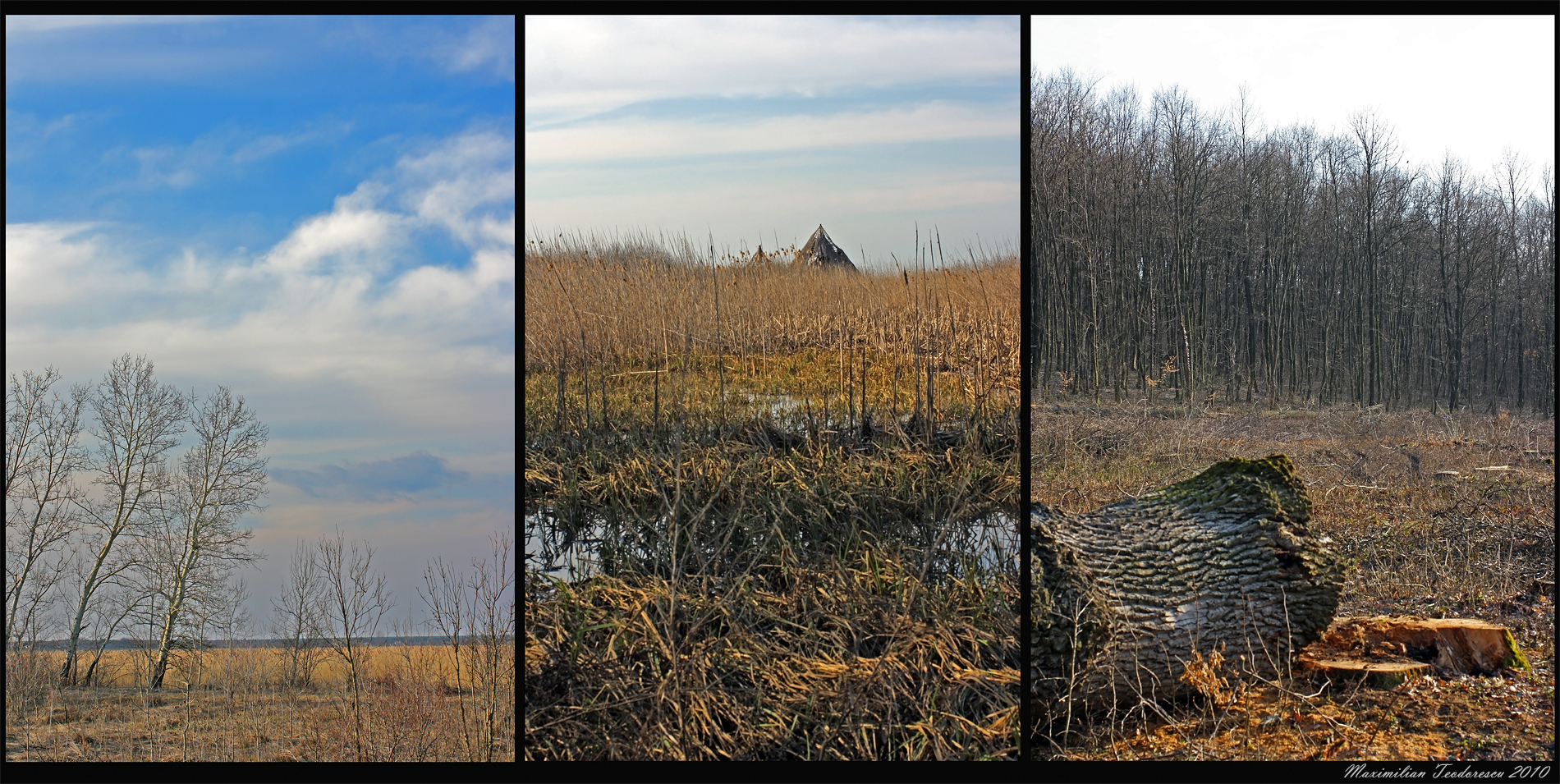 In fotografia-colaj de mai jos: o vedere spre Delta Neajlovului, locuintele lacustre (care in 2011 au fost deramate), si o zona defrisata cu ex-arbori seculari.