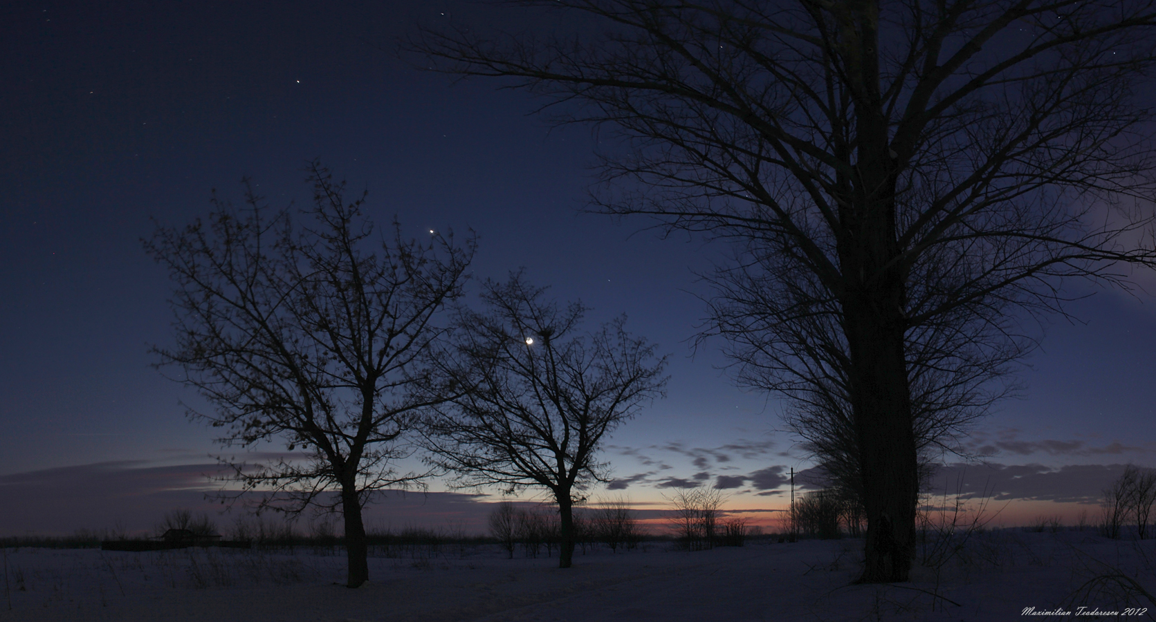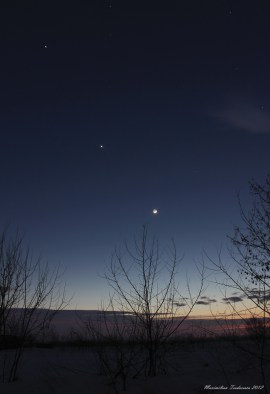 Zilele acestea (23-26 februarie) spre orizontul vestic, seara dupa apus, sunt observabile cele mai luminoase trei obiecte ceresti in afara de Soare. Si anume: Luna, Venus si Jupiter.
