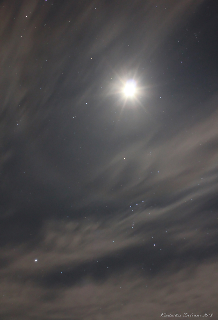 Ne hotaram noi sa schimbam locul de observatii si ne deplasam mai la nord cu 2 km, intr-un camp. Cand ajungem la destinatie, cativa nori reusesc sa imi spulbere sperantele de a realiza imagini la Luna. Insa partea buna: aceiasi nori au creat si halouri in jurul planetelor Venus si Jupiter, cat si un halo partial in jurul Lunii.