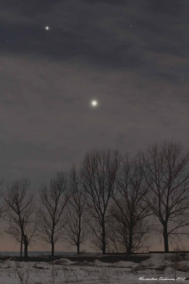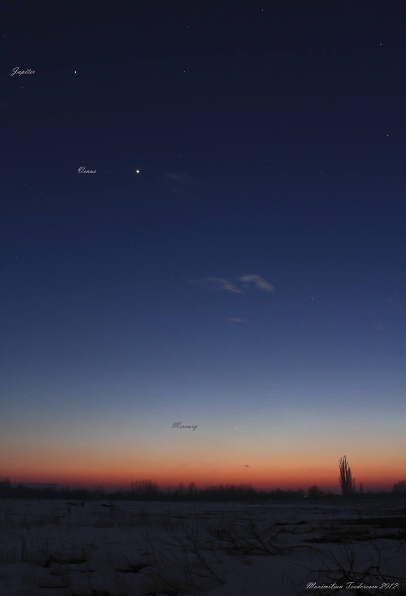 Subiectul principal: alinierea de seara, cu Mercur, Venus si Jupiter deasupra orizontului vestic, si cu o frumoasa Luna la o zi dupa Primul Patrar, undeva deasupra constelatiei Orion.