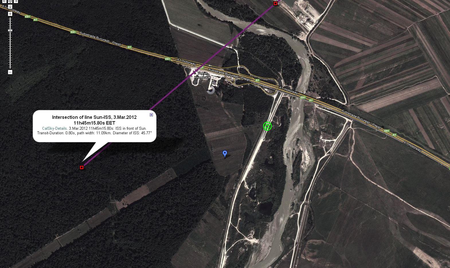 In harta de mai jos se observa proiectia traseului ISS pe sol, si locatia noastra (cercurile verzi). Atat harta cat si predicita tranzitului le-am gasit cu ajutorul Calsky.