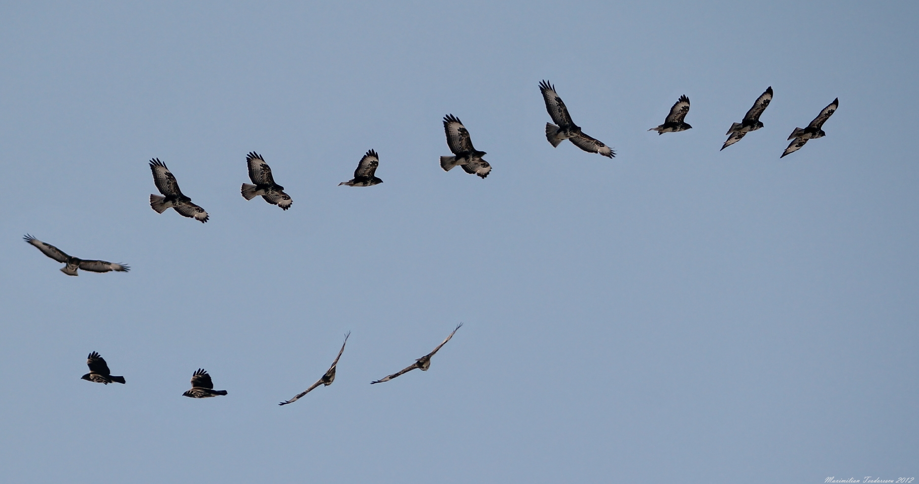 Dupa un survol de cateva minute, cei doi ulii se indreapta spre sud unde se fac nevazuti. In partea opusa fata de noi, la 300 metrii, un mic stol (8-10 exemplare) de porumbei incepe sa zboare rapid. Probabil erau fericiti ca pot zbura intr-o zi asa frumoasa fara amenintarea pradatorilor.