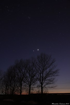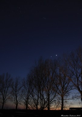 In aceasta seara am iesit la cativa kilometrii sud de Magurele pentru a fotografia conjunctia planetelor Venus (dr) si Jupiter (st).