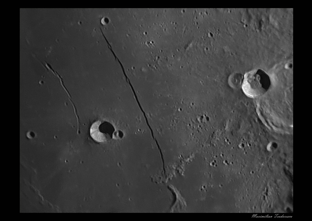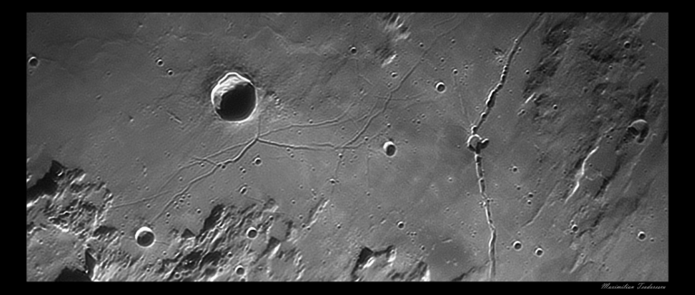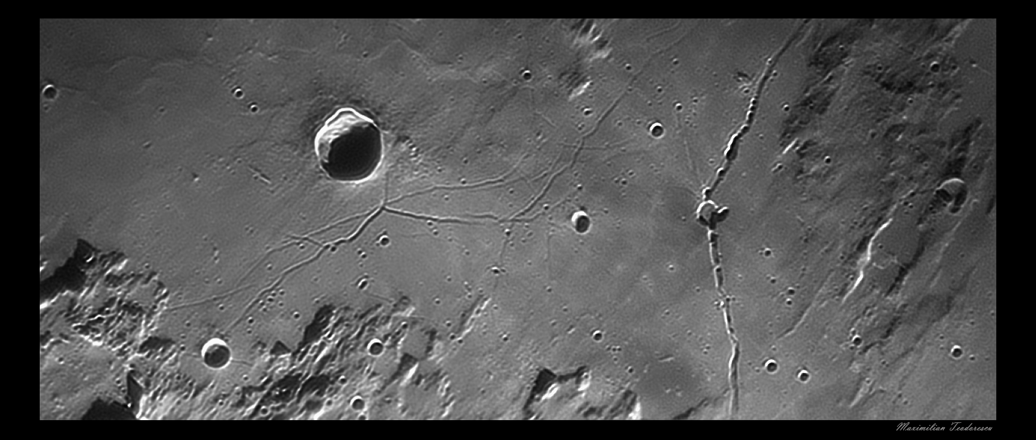 5. Rimele Hyginus si Triesneker, un complex de fisuri de mari dimensiuni. Se observa detalii si in interiorul craterului Hyginus (dreapta).