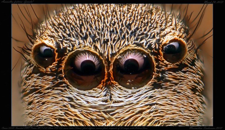 Postez insa acum un mare succes pentru mine, o fotografie prezentand ochii unui paianjen saritor, pe numele sau Asianellus festivus. O specie comuna la Padurea Comana in aceasta perioada. Exemplarul fotografiat este o femela avand latimea capului de 1.8mm !