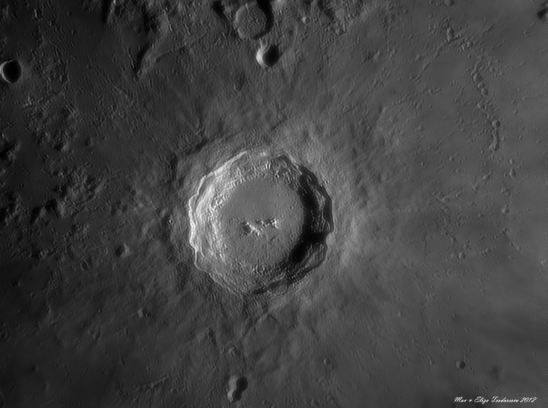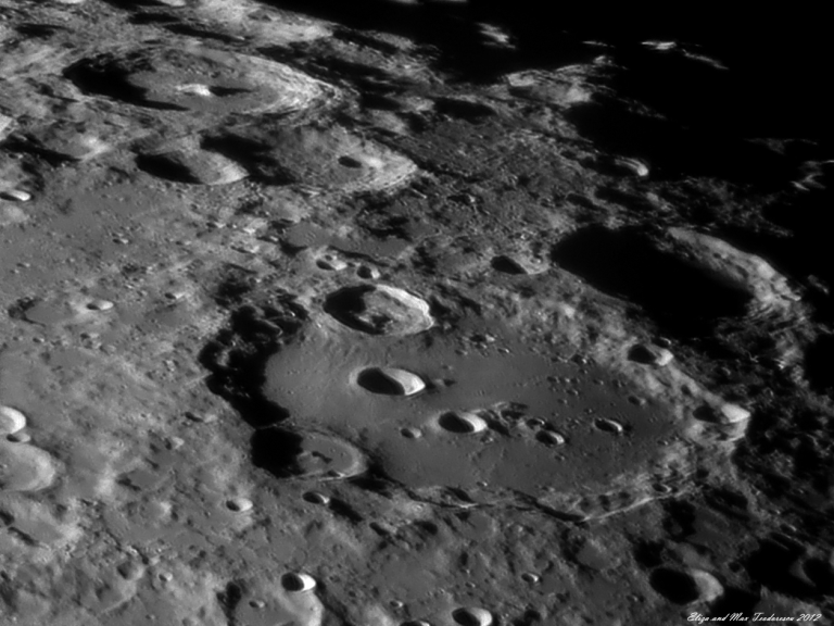 Primele imagini postate sunt cele la Luna din noaptea de 1/2 aprilie. In respectiva sesiune am avut parte de un seeing variabil de 5-6/10. Camera folosita a fost DBK 41 AU02.AS cu filtru IR pass. Imaginile sunt media a 3000 din 5000 cadre, procesate cu Registax 6, Astra Image si Photoshop CS2. Cum in cazul unora dintre imagini sotia a avut importantul rol de a corecta ghidajul (montura nefiind perfect pusa in pol) cat si o a doua opinie in prvinta focalizarii, este si ea prezenta la autori. E bine sa fi casatorit si sa te mai inteleaga si nevasta š