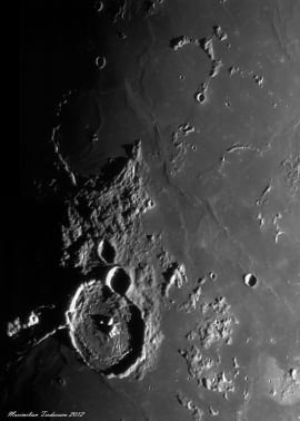 Urmatoarea noapte (2/3 aprilie) a inceput cu un seeing mult mai prost (desi telescopul era aclimatizat), de doar 3/10, rezultand cateva imagini la Luna foarte slabe. Dintre ele am selectat doar una, cu craterele Gassendi si Letronne pe Terminator: