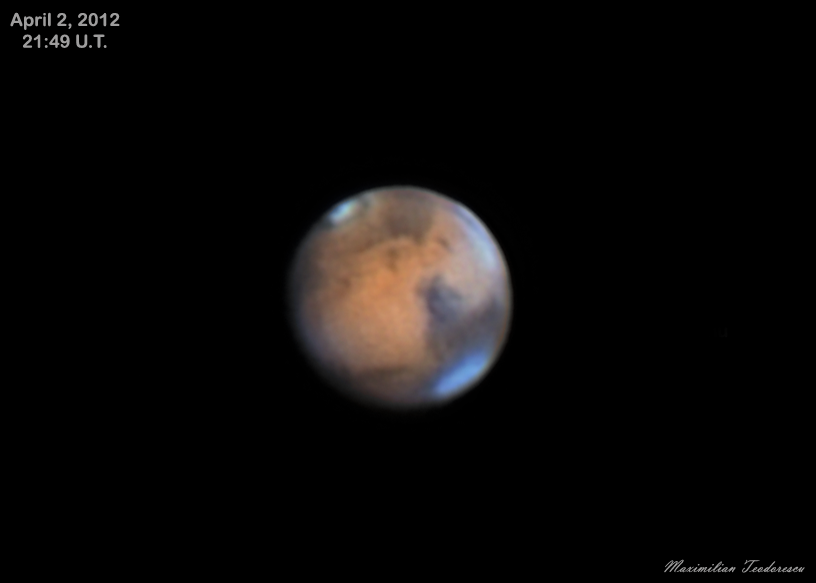 Dupa cateva incercari nereusite la Luna, si odata cu venirea unui strat fin de nori cirrus, mi-am mutat atentia spre planeta Marte. Si surpriza ! Seeing-ul a urcat de la 3/10 la 5-6/10 !