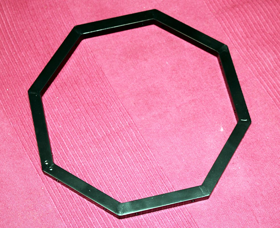 Prima piesa a noului telescop am reusit sa o termin chiar azi; e vorba de unul dintre cele doua octogoane ce intra in constructia custii oglinzii principale. Dupa 4 ore de munca (in doua zile) folosind un profil (teava) patrat de aluminiu (15 mm), un raportor, un creion, un bomfaier, o bormasina, o pila, ceva adeziv Bizon pentru metal, smirghel si vopsea negru-mat, am reusit sa scot asta: