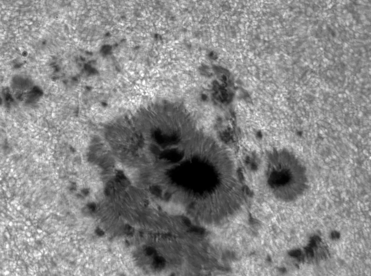 In zona in care granulatia este supraexpusa (imediat deasupra petei principale) cred ca va avea loc o eruptie; intensitatea diferita a acelor granule nu se datoreaza deformarii imaginii (din cauza turbulentei) si nici procesarii mele (aceasta fiind realizata uniform pe toata imaginea). Cert este ca temperatura zonei respective este mai mare decat a zonelor invecinate.