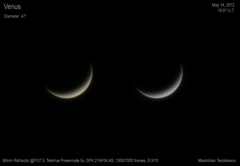 Rezultatul, obtinut intr-un seeing oribil de 3/10, este mai jos. Planeta se afla la momentul achizitiei la doar 21 de grade deasupra orizontului vestic. Ceea ce a ajutat la obtinerea unei forme corecte a fazei planetei a fost diametrul sau mare: 47 de secunde de arc !