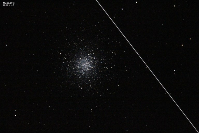Am avut norocul sa surprind intr-unul din cadre si un satelit artificial destul de luminos in trecerea sa prin campul fotografiat: