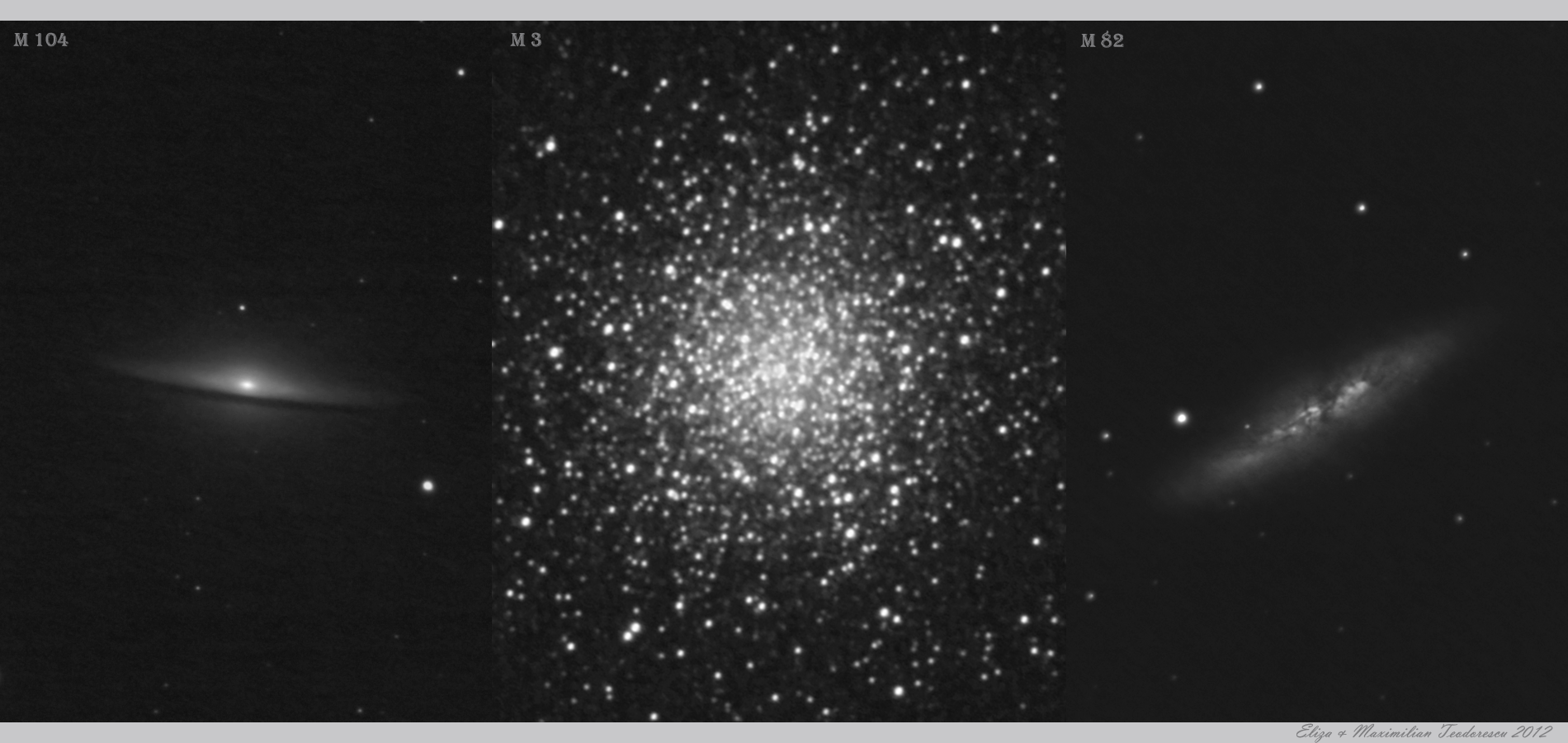Toate imaginile din colajul de mai jos sunt realizate de pe un cer de magnitudine +5 in focarul telescopului cu un Canon 550D si beneficiind doar de ghidajul automat “nativ” al monturii. Cadrele au fost achizitioante la ISO 12800 (!!!) si au avut timpi de achizitie de 20 secunde. Numarul de cadre per obiect a fost de 16 (pentru M 104), 21 (pentru M 82) si respectiv de 25 (pentru M 3).