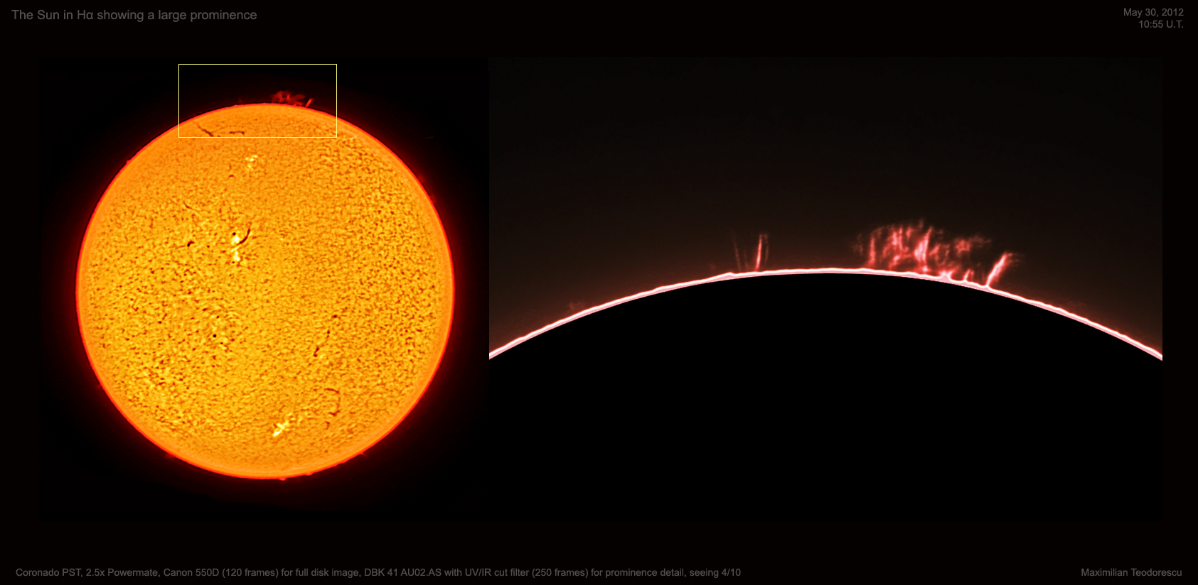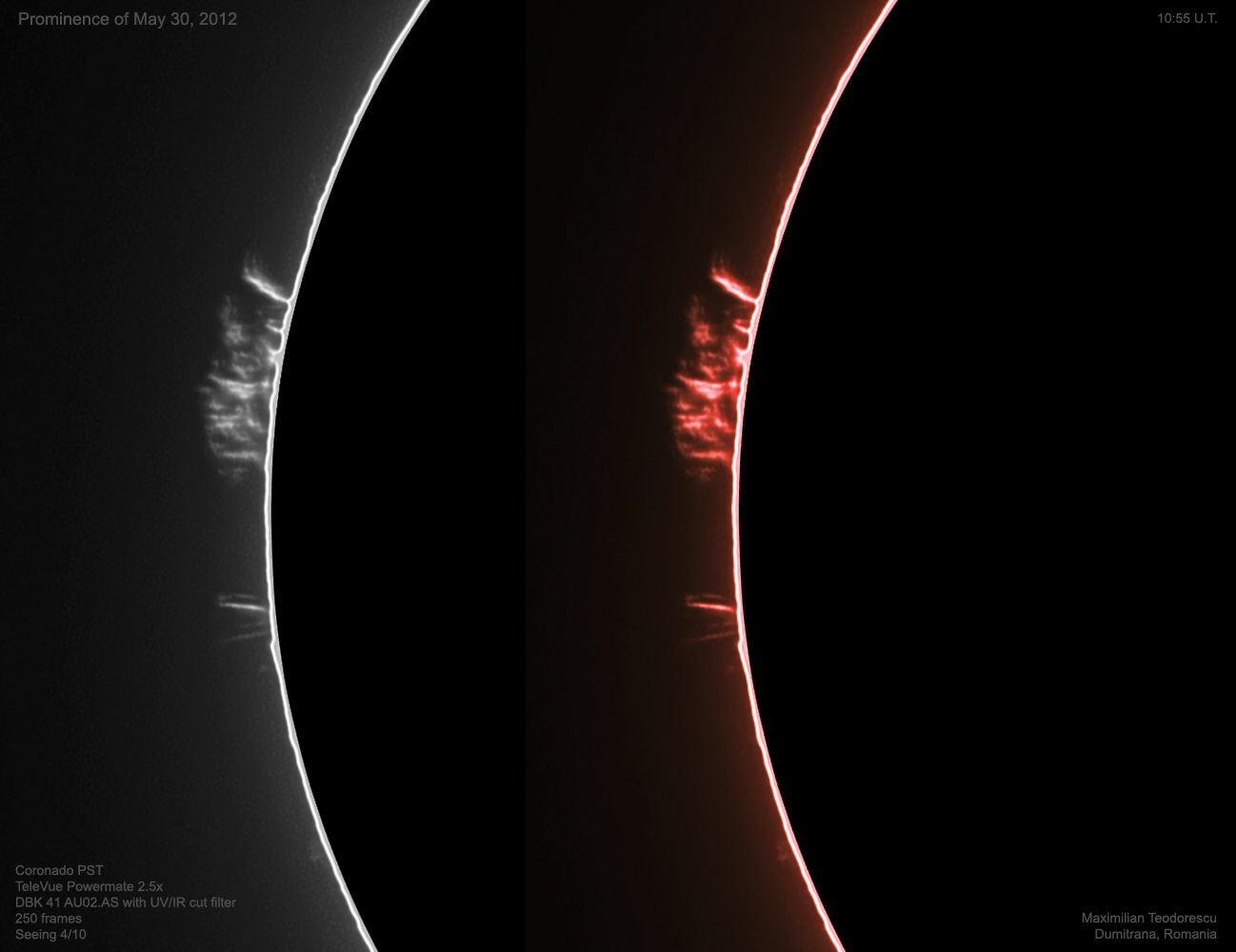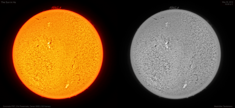 De multi ani imi doream sa observ protuberantele solare si sa realizez imagini ale acestor schimbatoare detalii aflate la marginea discului solar. Lungimea de unda in care se pot observa aceste fenomene a fost insa intotdeauna prea departe de mine, atat tehnologic cat si financiar. De curand insa am imprumutat de la Adi Sonka un telescop solar Coronado PST pe care am avut imensa placere de a-l testa in cursul unei zile cu cer acoperit de nori in proportie de 90%. Singura fereastra intredeschisa spre Soare mi-a permis vizualizarea sa continua pentru nu mai mult de 30 de minute. Timp suficient atat pentru a observa vizual protuberante si alte fenomene de la suprafata Soarelui, cat si pentru a realiza cateva imagini.