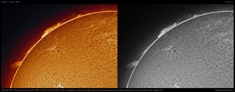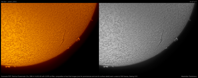 Prima imagine cuprinde limbul vestic al Soarelui, cu cateva regiuni active (se observa si pete) si protuberantele aferente “rasarind”: