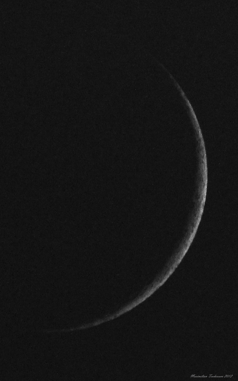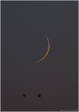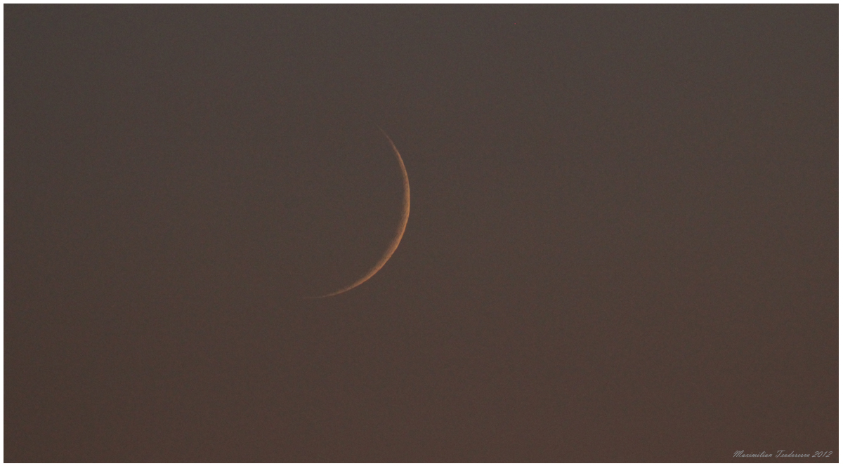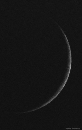 Impreuna cu Clau am plecat spre Comana putin inainte de apusul Soarelui, ajungand in apropierea Deltei Neajlovului pe la orele 21:30. Aici am asteptat putin pentru ca norii prezenti deasupra orizontului vestic sa ne permita gasirea Lunii in forma de secera relativ fina: