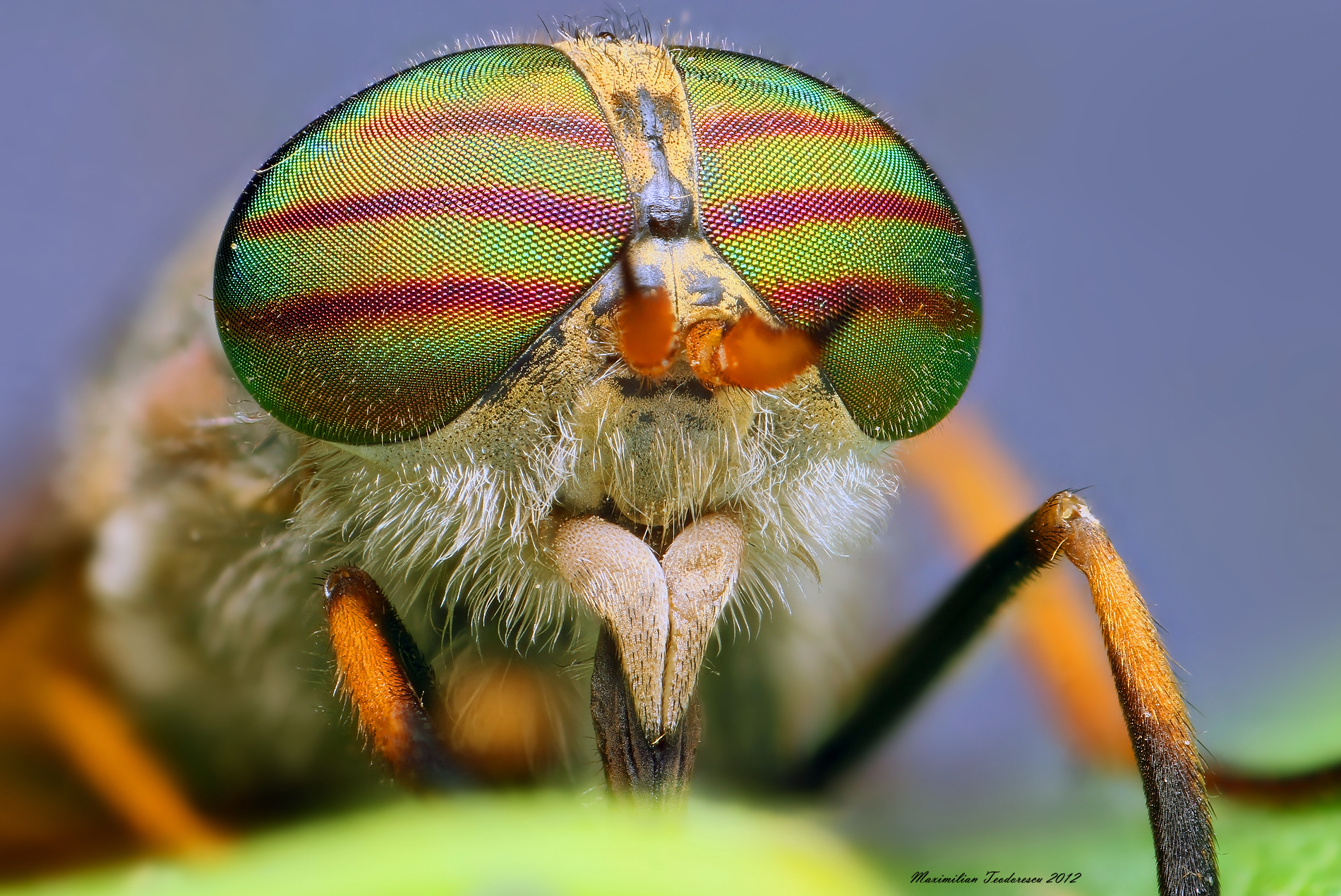 Si un prim rezultat, o imagine realizata din doar 64 de fotografii, prezentand un subiect interesant vizual dar foarte enervant in Natura: taunele (in cazul de fata fiind vorba de specia Tabanus lunatus). Dimensiunea capului (la extremitati: 5mm).