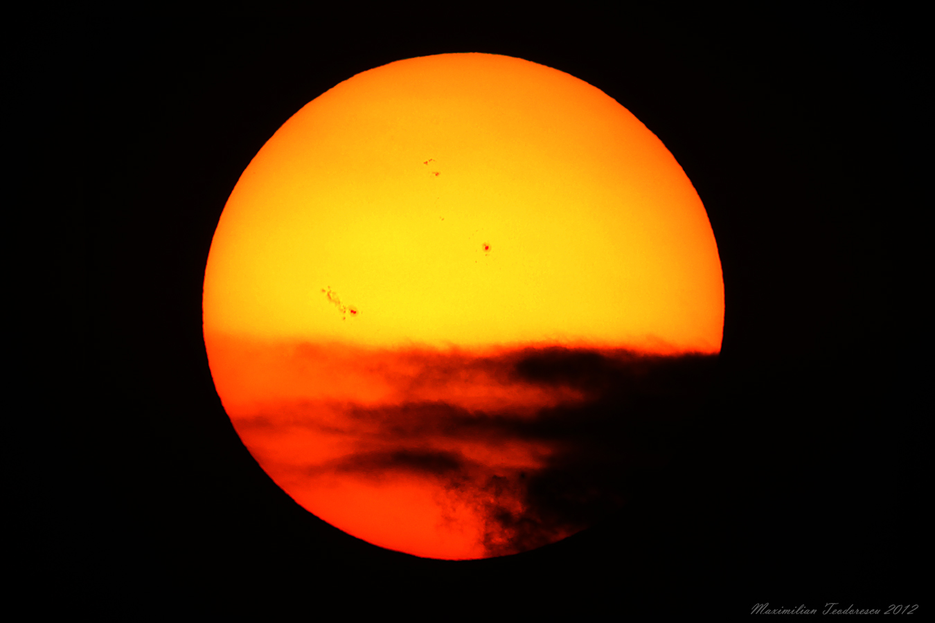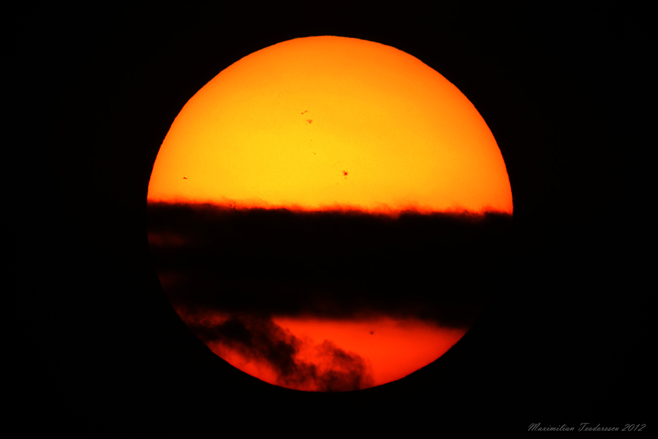 Inarmat cu aparatul Canon 550D si micutul telescop Maksutov de 90mm, am reusit cateva fotografii pana ce astrul zilei a “reusit” sa se ascunda dupa ceva nori aparuti la cateva grade altitudine deasupra orizontului vestic.