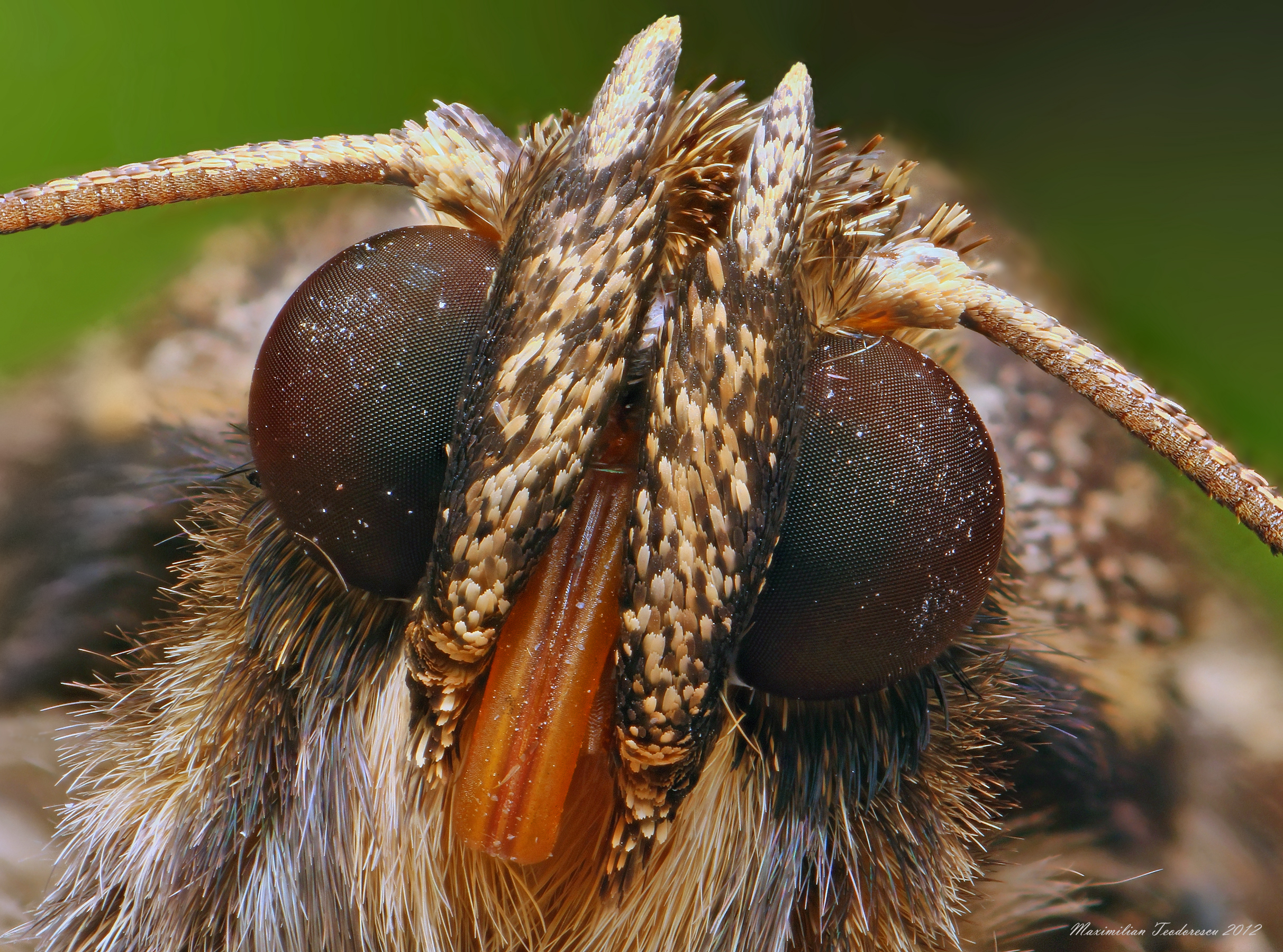 E vorba de un fluture din specia Amphipyra pyramidea. Latimea capului (la nivelul ochilor) este de 3 milimetrii.