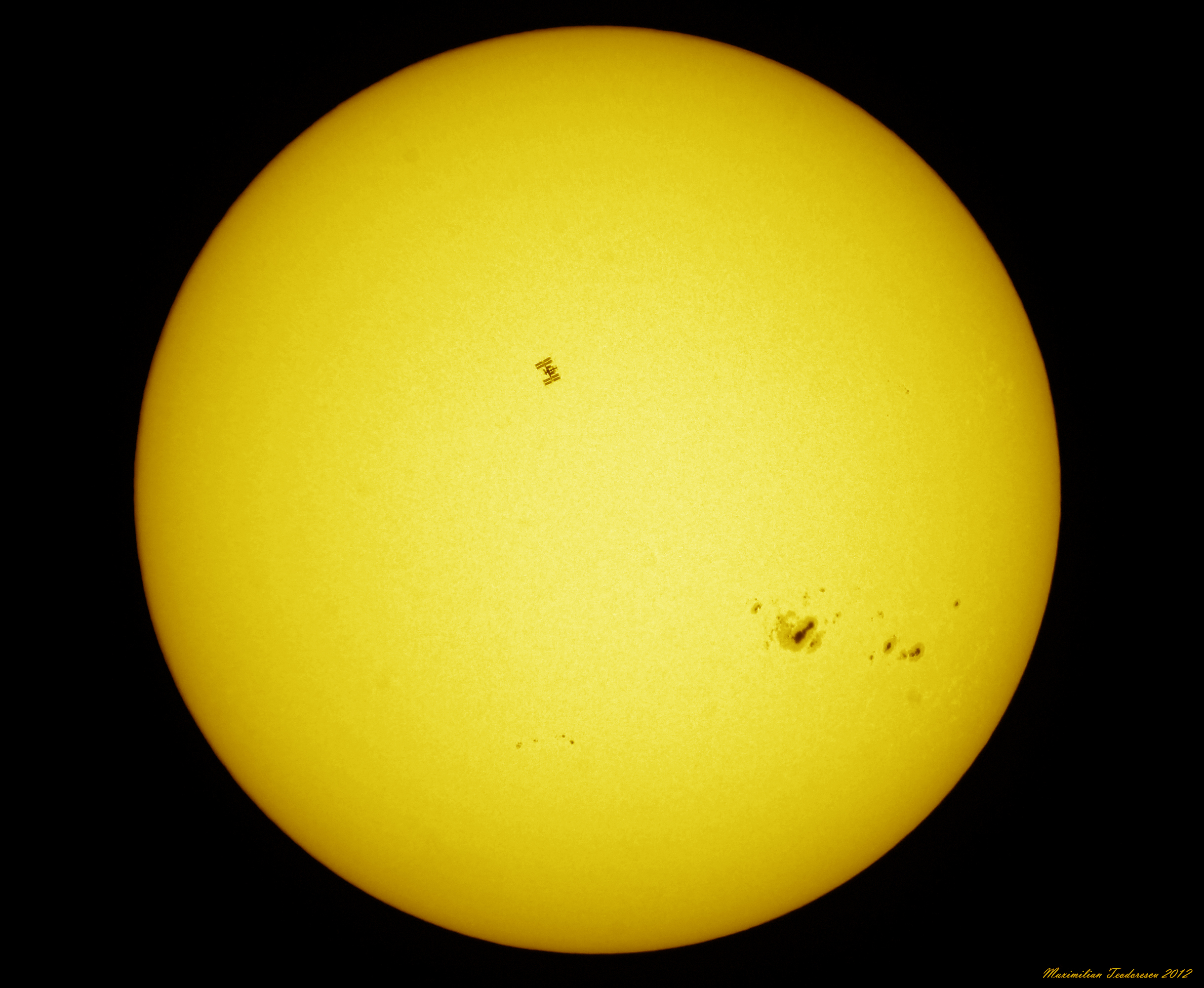 Intr-adevar a iesit bine, insa mai am una asemanatoare de anul trecut. Am avut noroc de seeing bun pe suprafata Soarelui chiar in momentul si locul unde si cand a trecut statia. Daca as fi avut un instrument mai mare in diametru sigur ar fi iesit ceva “de revista”, insa pana cand o sa pot folosi telescopul mare la asa ceva…mai dureaza.