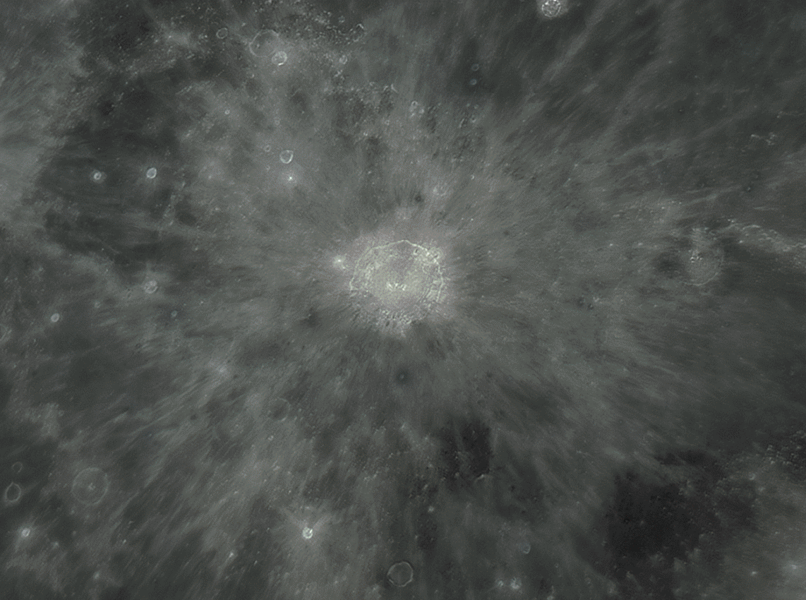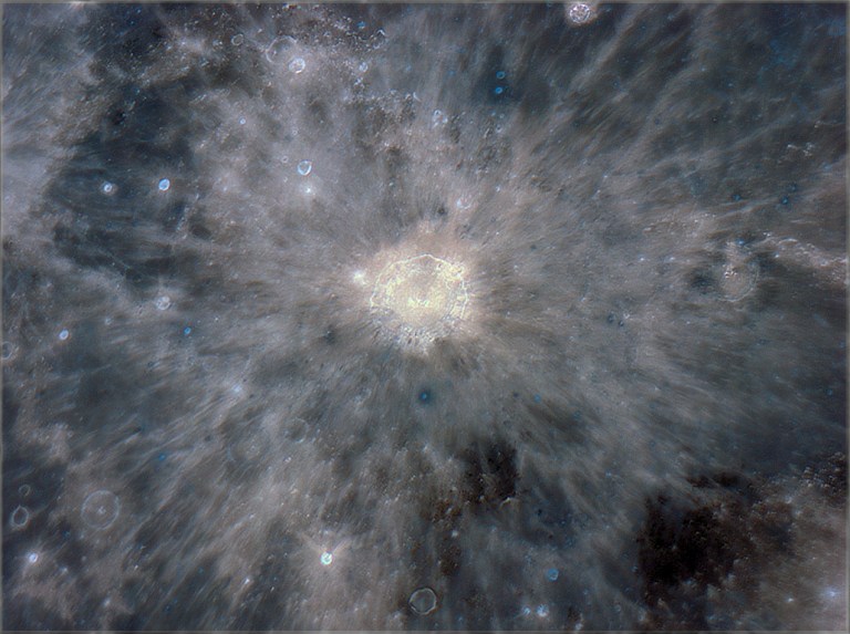 Am procesat zona craterului Copernic si intr-o imagine mult exagerata, combinand informatia de culoare cu o supra-procesare a razelor ramase in urma impactului: