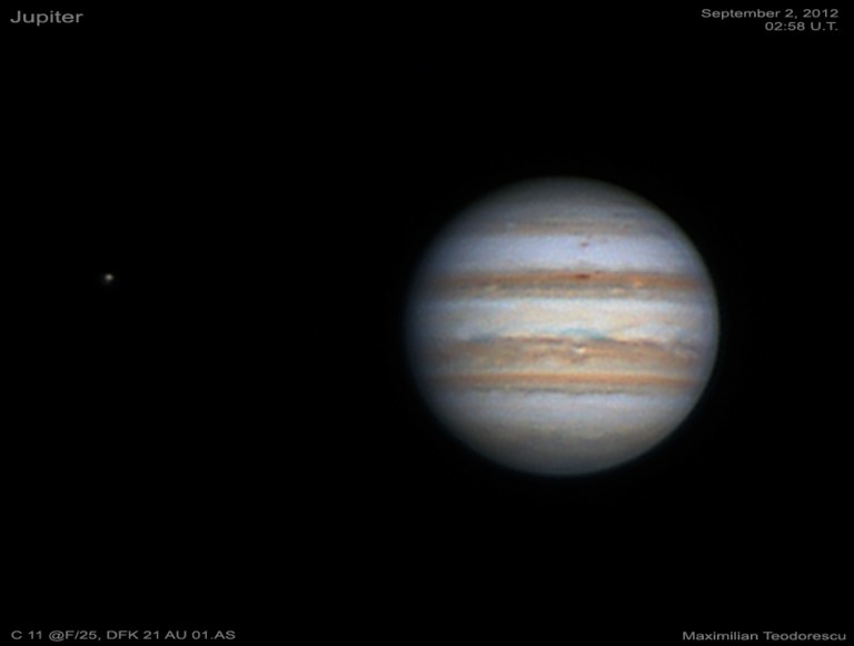 Pe langa aceste imagini lunare am avut ceva timp si seeing bun (5-6/10) pentru a mai realiza si cateva imagini cu planeta Jupiter. Deocamdata am procesat doar un set de cadre, urmand sa realizez si o animatie daca si celelalte fisiere .avi surprind planeta in momente de turbulenta mica. Imaginea de mai jos este un stack a 1400 cadre.