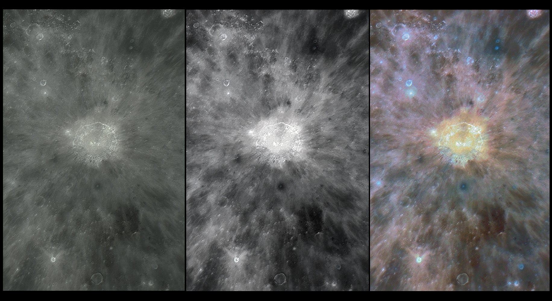 In cele doua imagini lipite se observa un numar de cratere cu marginile ori exteriorul lor albastrui, semn al “nasterii” ceva mai recente fata de regiunile inconjuratoare, culoarea albastra indicand prezenta titanului (Ti) provenit din subteranul suprafetei lunare, prin expulzarea datorata fortei impactului asteroizilor cu suprafata lunara.