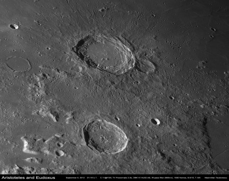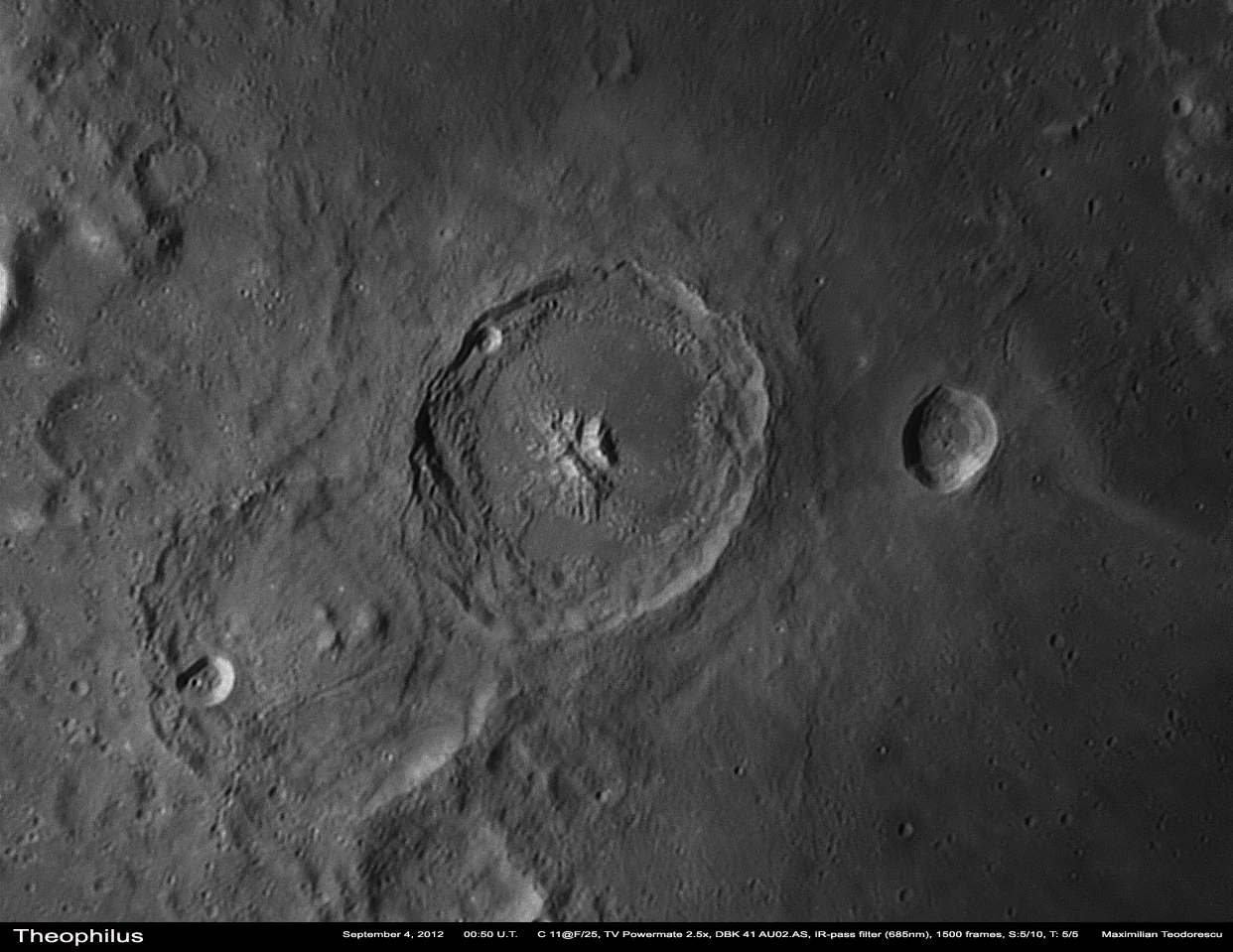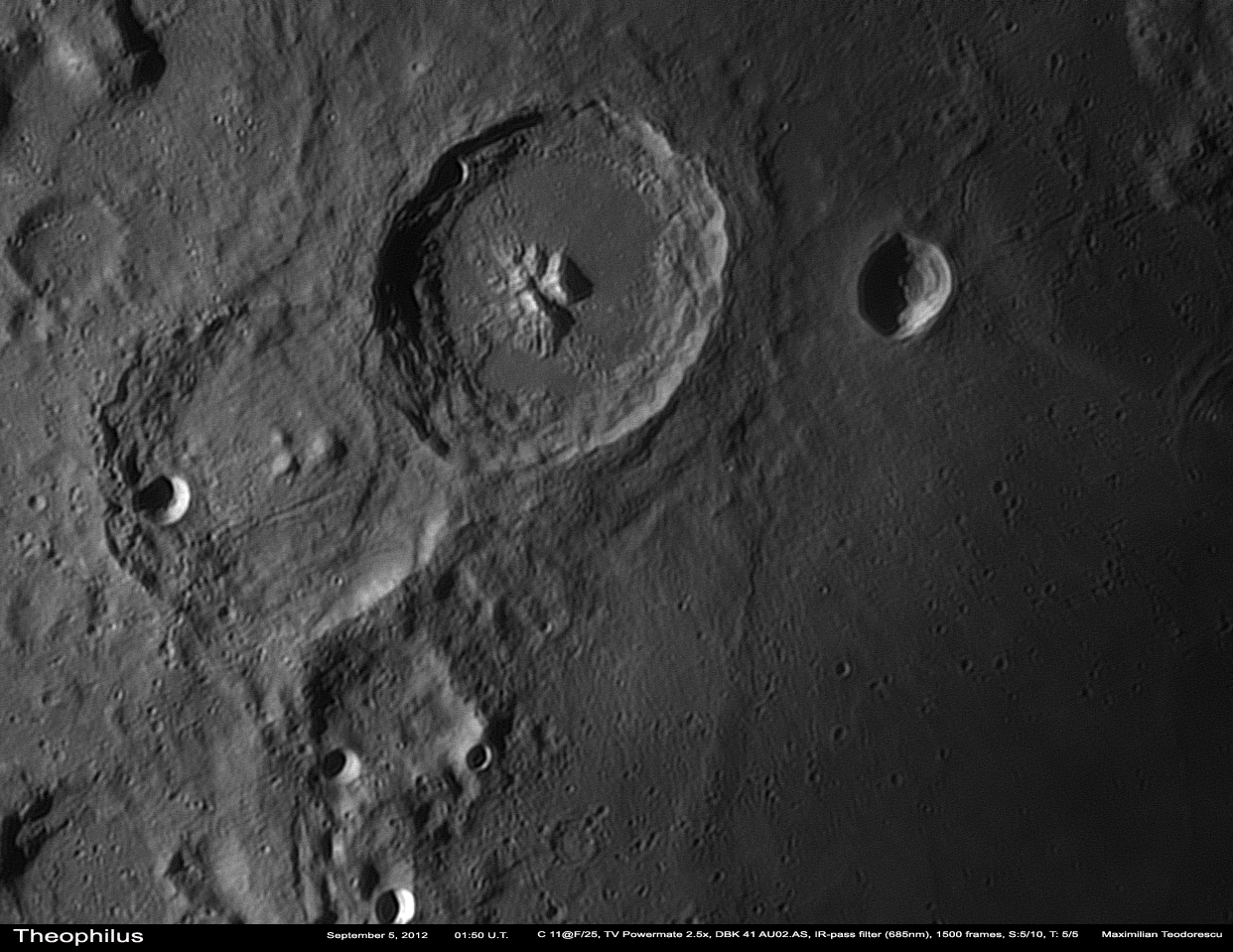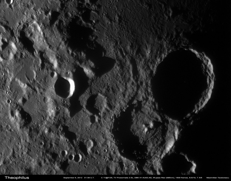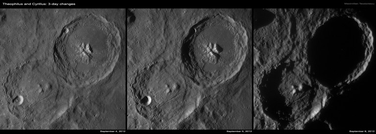 Incep cu o animatie, realizata din cadre achizitionate in zilele de 4 si 5 septembrie, si avand ca subiecte craterele Theophilus si Cyrillus. Dupa cum se stie, Luna prezinta si o miscare de libratie pe langa cea de rotatie, ceea ce face ca de la o zi la alta unghiul sub care observam detaliile sa se schimbe putin. Astfel, in animatia urmatoare, pe langa avansul umbrelor se observa si schimbarea de perspectiva, ceea ce da un efect de tridimensionalitate reliefului.