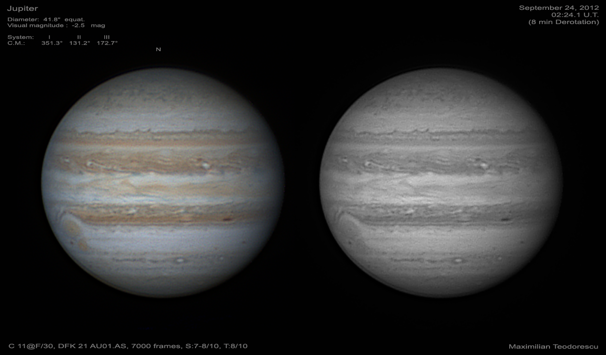 Ei bine subiectul noptii a fost si el pe masura conditiilor atmosferice oferindu-mi detalii interesante cum ar fi Marea Pata Rosie (GRS) si “ovalul” BA aflate in conjunctie, si o multime de detalii fine in benzile ecuatoriale.