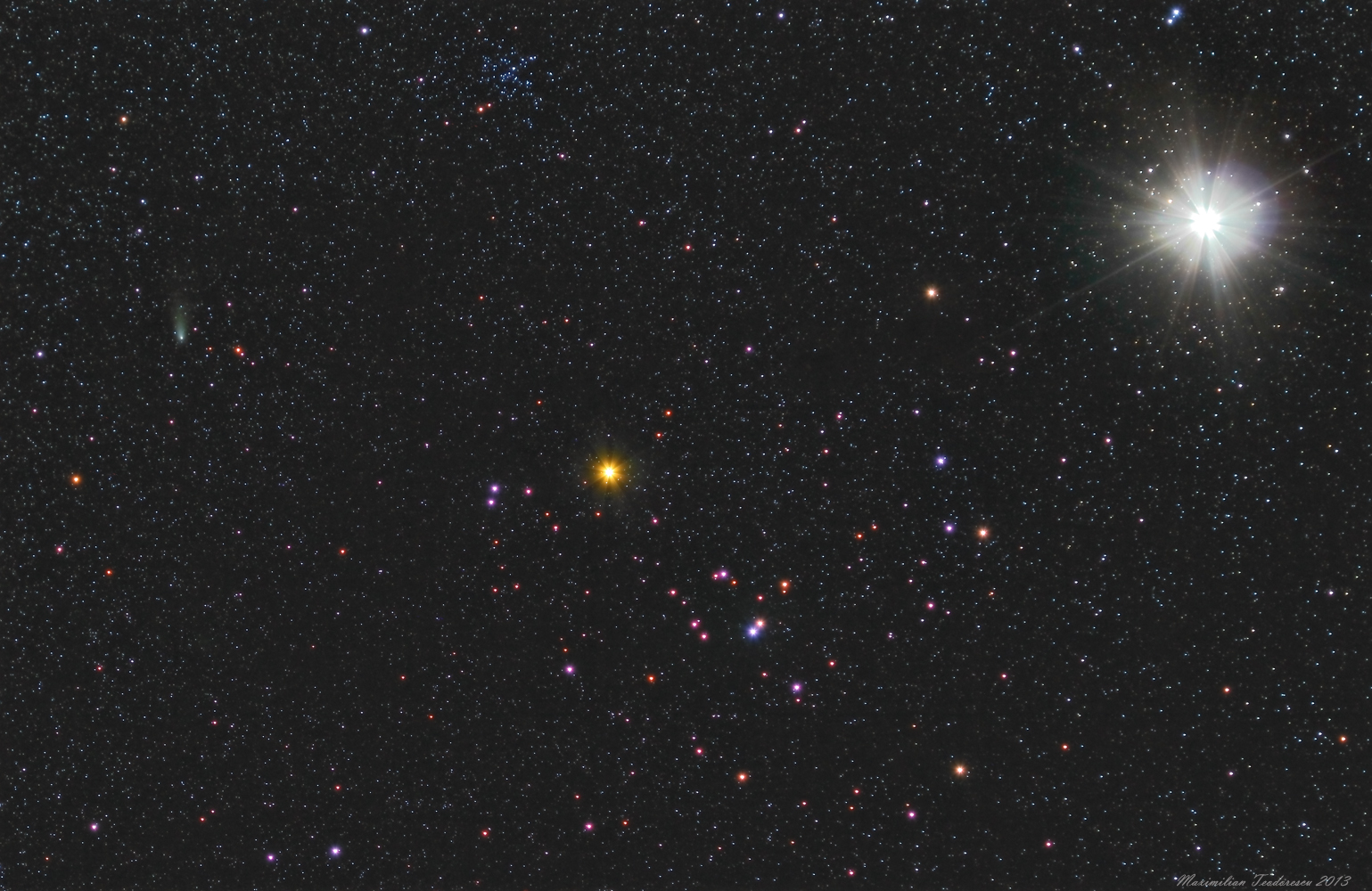 Si imaginea rezultata, media a 42 de cadre pentru un timp total de expunere de 40 si ceva de minute realizate in conditii slabe (ceata) ce prezinta cometa, roiul Hyadele, inca un roi de stele si planeta Jupiter: