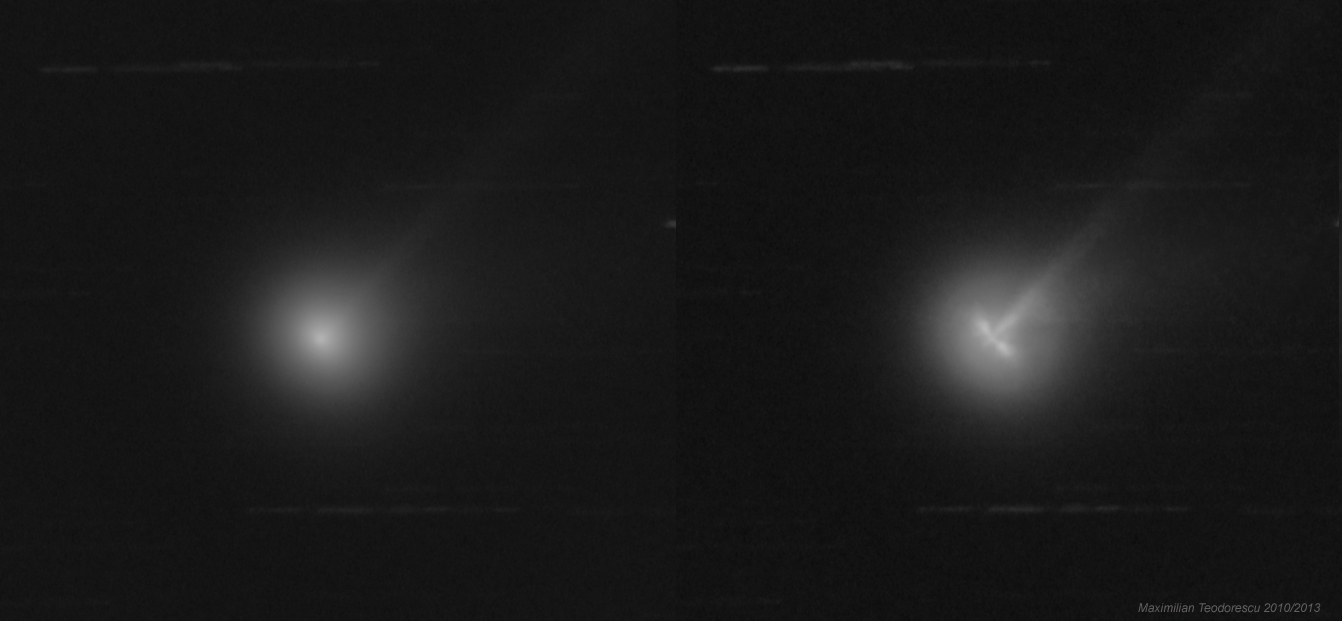 Desi am refacut procesarea in MaximDL de mai multe ori utilizand diferite unghiuri de rotatie (intre 2 si 60 !!!) crezand ca ce vad sunt artefacte de procesare,  cele doua jeturi foarte luminoase laterale pozitionate la 90 de grade fata de coada principala par a fi foarte reale. In zona nucleului sunt observabile si alte mici neuniformitati care cel mai probabil sunt tot jeturi, insa mult mai putin evidente.