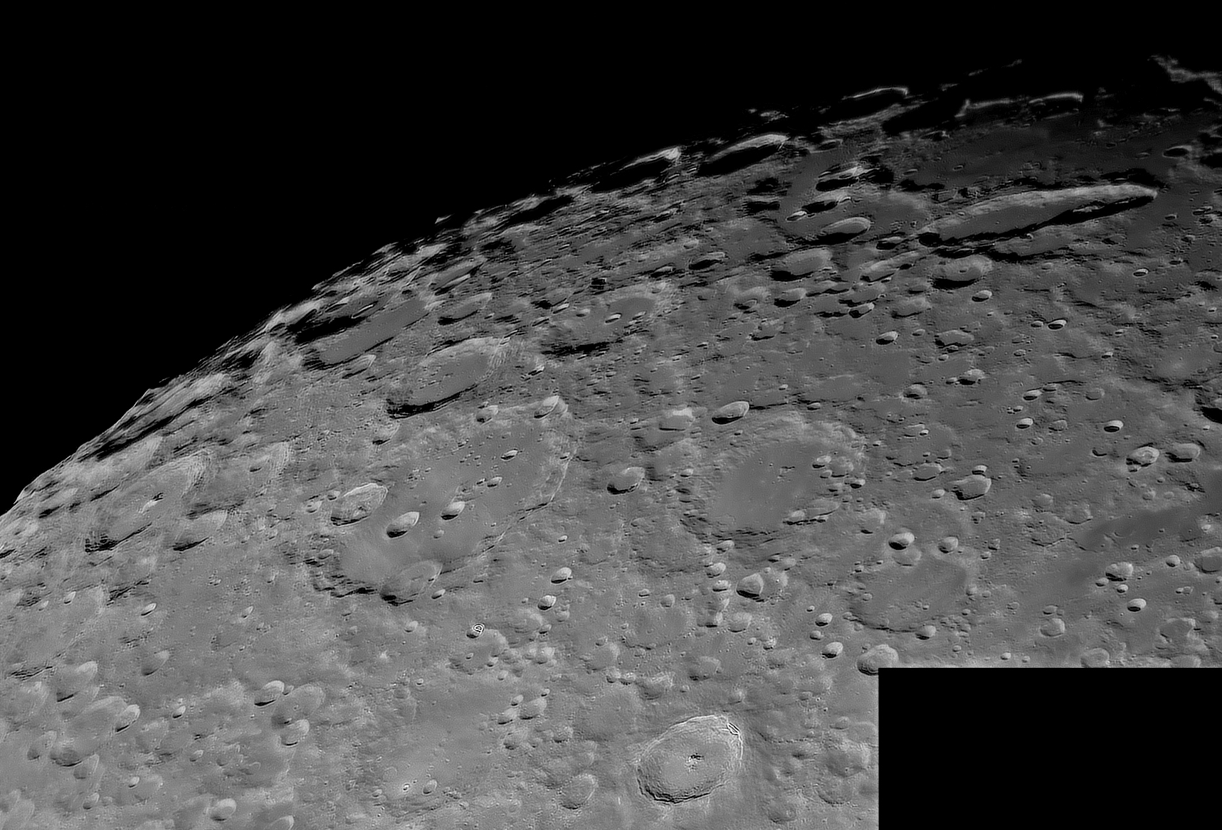 Si cea de a treia zona: un colaj din doua imagini, fiecare media tot a 3800 cadre din 5000. Circul lunar Clavius este de aceasta data centrul atentiei, cu Polul Sud Lunar undeva deasupra sa.