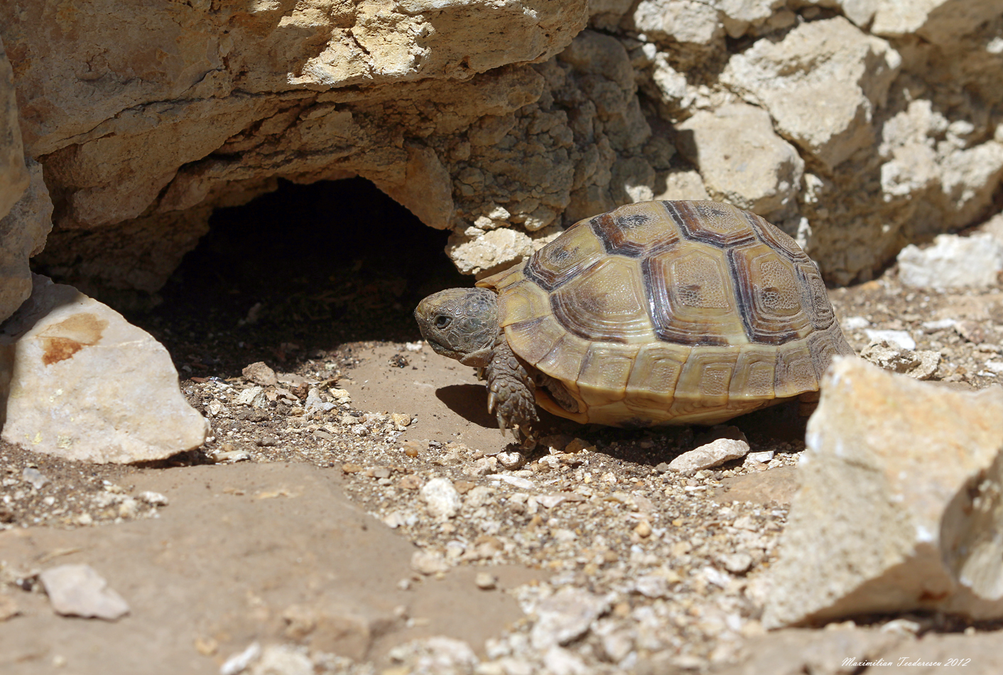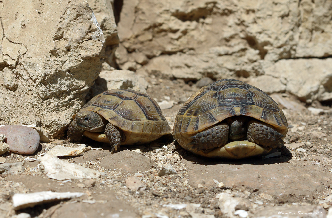 La baza acestor pereti de calcar, testoasele dobrogene (Testudo graeca) isi fac planuri pentru viitoarele case: