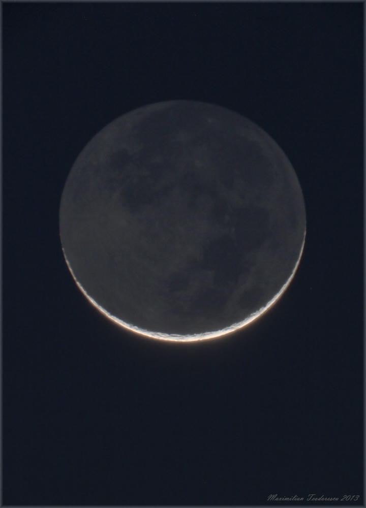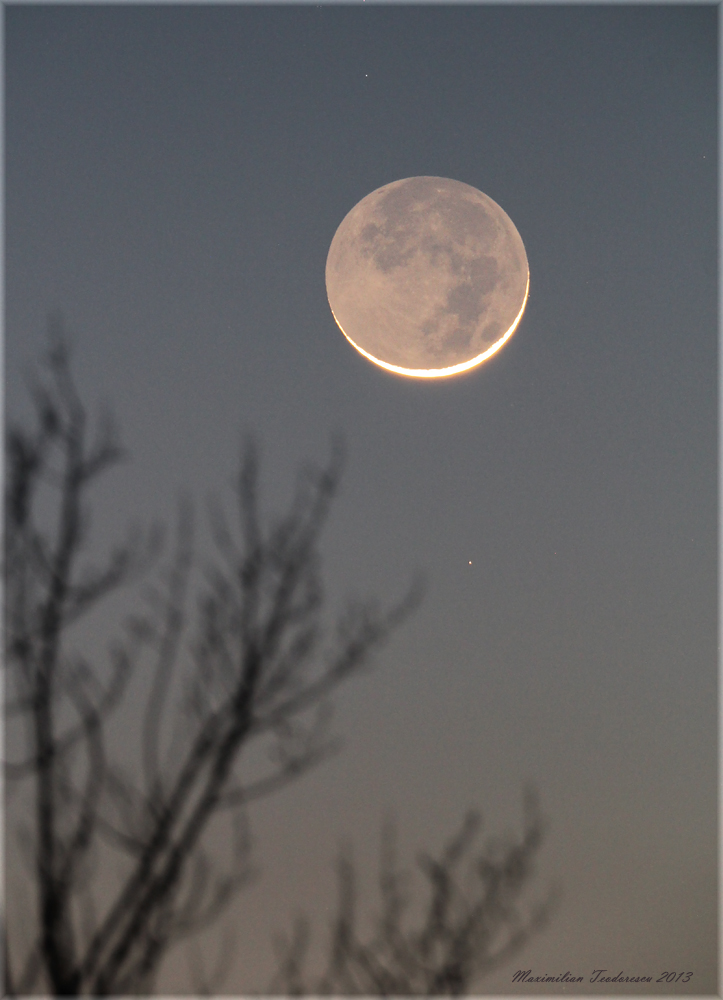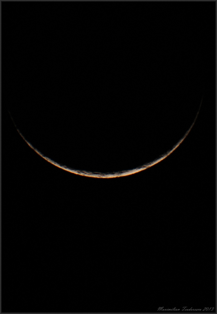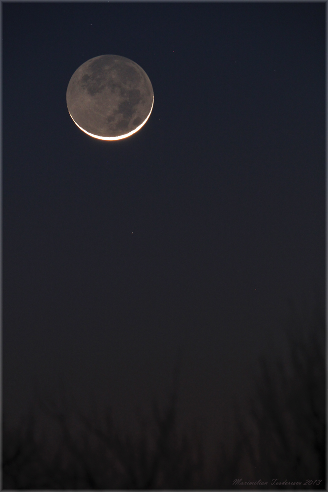 Am inceput cu o superba Luna in faza de secera destul de subtire (cu tot cu “lumina cenusie”), amplasata aproape paralel cu orizontul sud-vestic. Imaginile sunt realizate cu un Canon 550D in focarul lunetei.