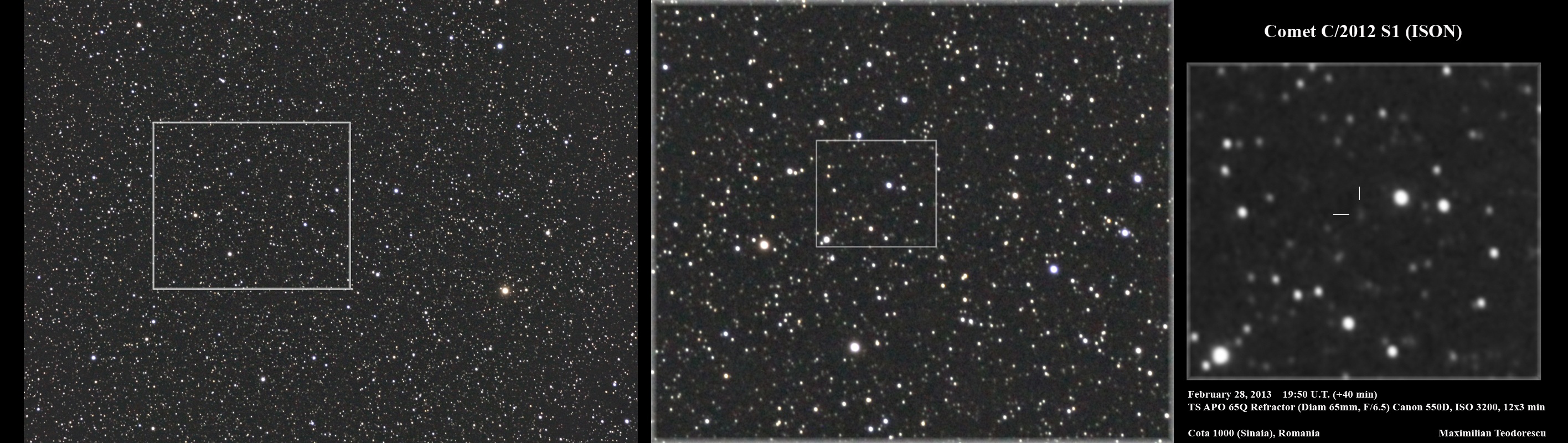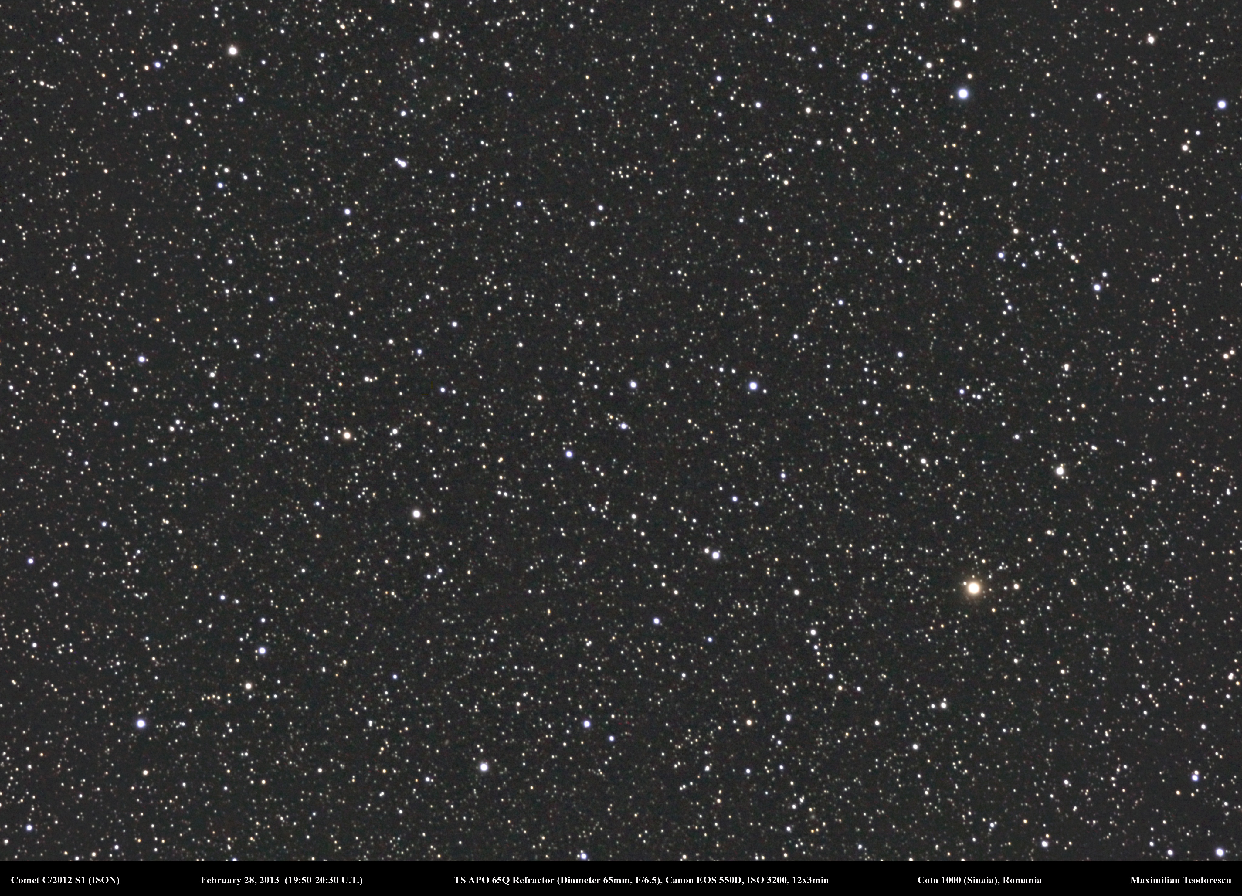 Desi nu pare prea interesant, si e si la limita vizibilitatii chiar in aceste imagini, micul obiect difuz o sa devina (sa speram) spre finalul anului 2013 cel mai important subiect fotografic si vizual de pe cer. Pana atunci ma multumesc cu identificarea cometei ISON intr-un camp de stele. Mai mult, ma multumesc cu gasirea si observarea ei (fotografic) printr-o luneta de doar 65mm diametru !