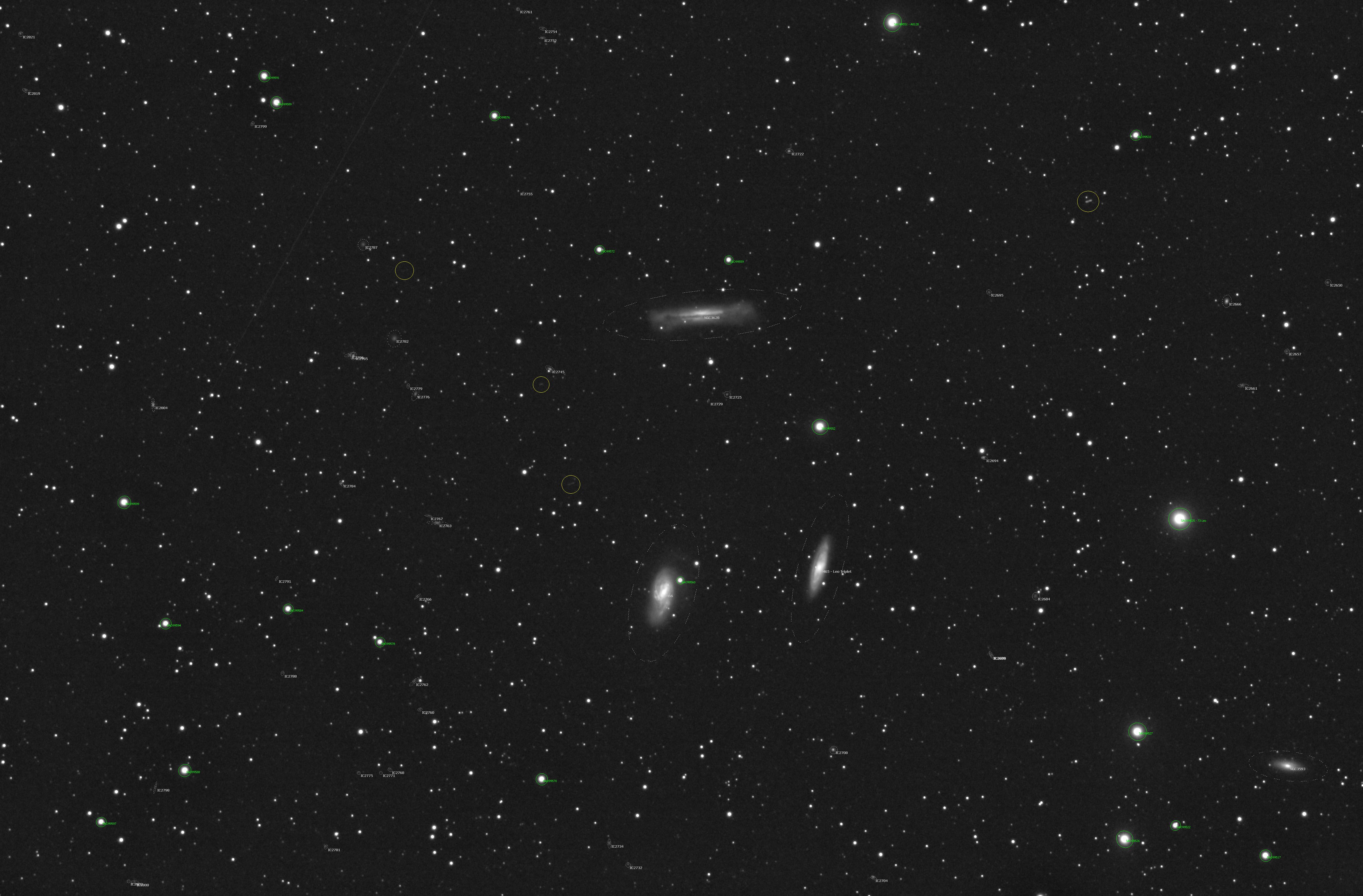 Pentru a “avea o idee” de distributia galaxiilor in imagine, postez si un “identificator” pentru o parte dintre galaxiile din imagine (vreo 50) marea parte apartinand catalogului Index Catalogue (IC). Imaginea de mai jos este rezultatul identificarii via softul Unimap (cercurile verzi sunt identificari ale unor stele). Tot in imagine sunt notati si cei patru asteroizi observabili (cercurile galbene) ce apar ca linii datorita deplasarii pe durata expunerilor.