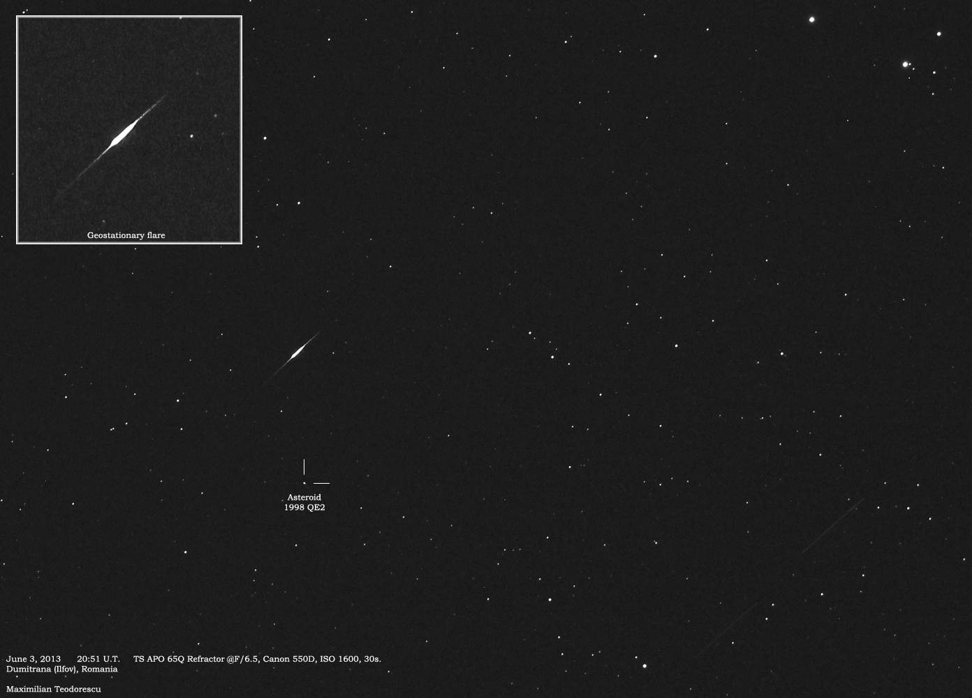 Si o animatie realziata din 81 de cadre in care asteroidul se observa deplasandu-se intr-un interval de aproximativ 43 minute. Se observa si “ploaia” de dare luminoase, in realitate sateliti geostationari.