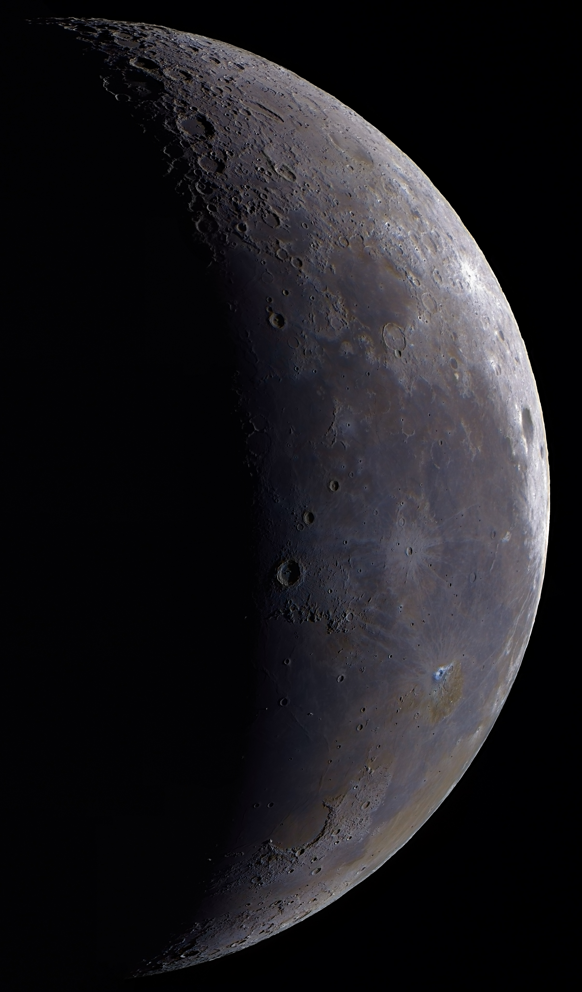 Combinand imaginea de mai sus cu o imagine achizitionata folosind Canon-ul 550D in focarul telescopului (100 cadre la ISO 400), am realizat si un colaj color, cu saturarea tonurilor pentru a reliefa mineralogia generala a suprafetei lunare.