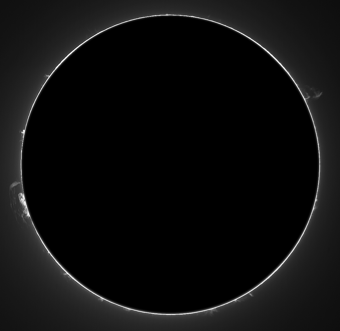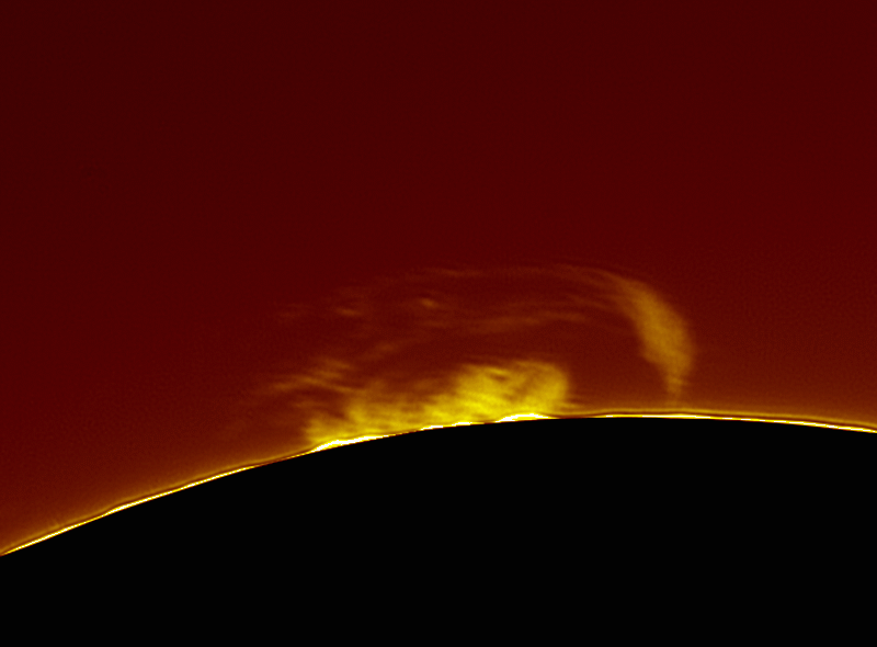 Incep cu doua imagini generale ale limbului solar plin de protuberante, realizate in focar. Prima imagine are ca etalon (dreapta jos) discul intunecat al Pamantului, pentru comparatie.