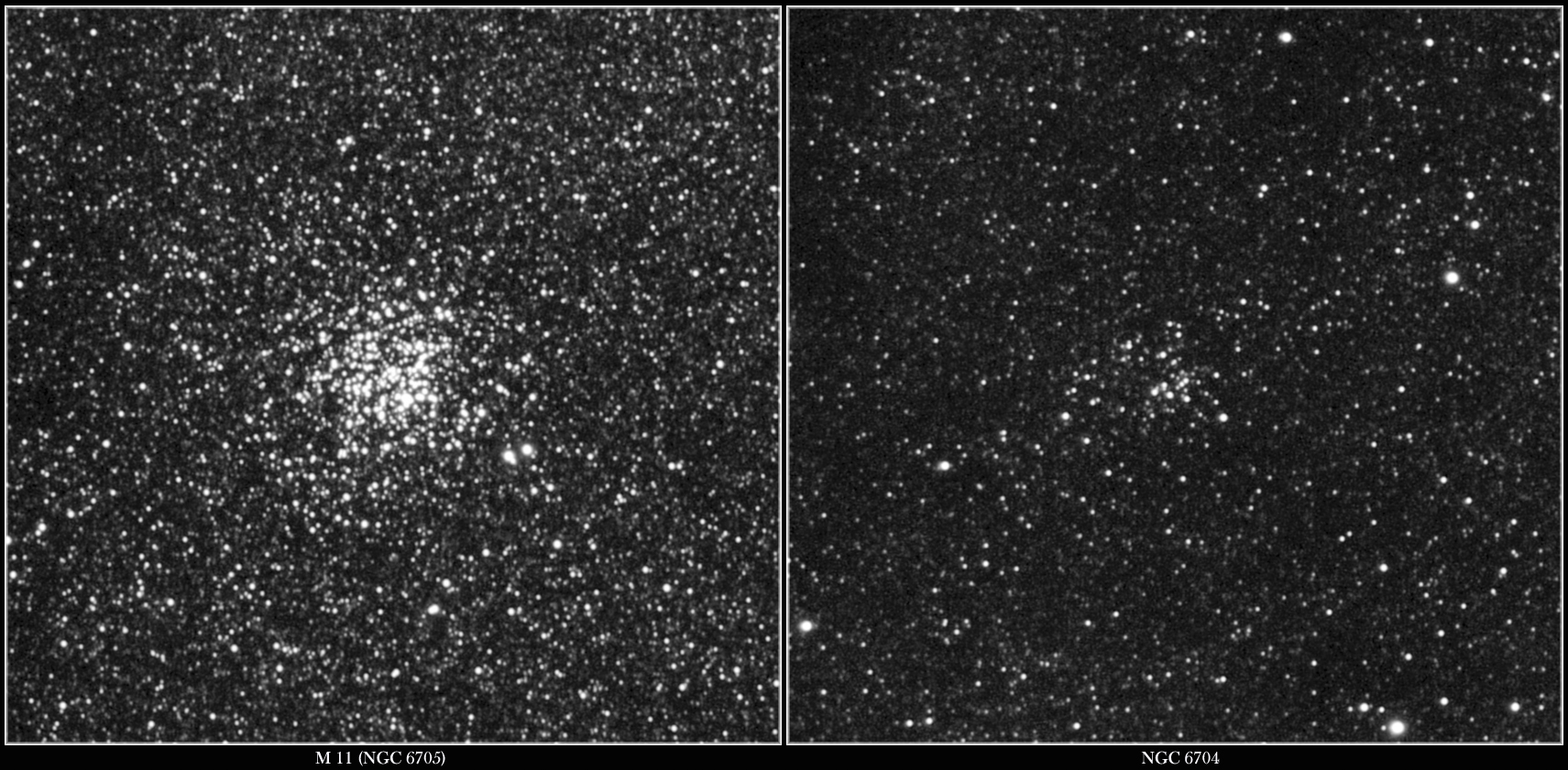 In imaginea de mai sus (in partea stanga) se observa si un al doilea roi deschis (NGC 6704), ambele fiind prezentate mai in detaliu in colajul de mai jos: