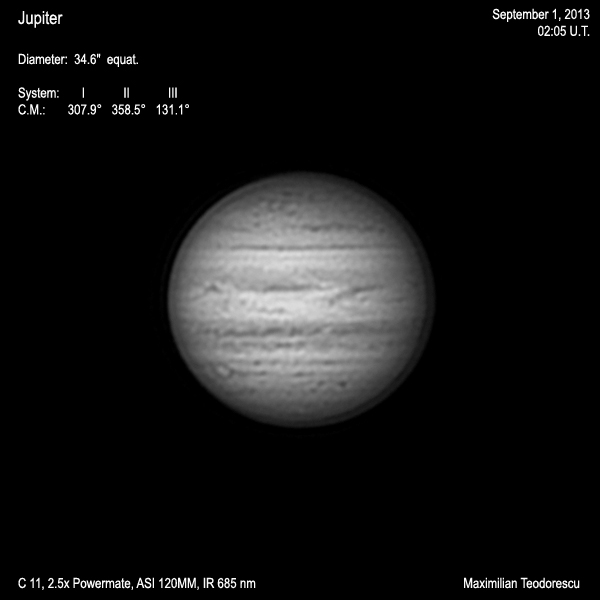 Din pacate, setarile necesare pentru achizitia imaginilor in cazul acestei planete in infrarosu apropiat (la 685nm) au dus la expuneri de 1 secunda per cadru, mult prea mult pentru a reusi sa surprind si benzile de nori prezente in atmosfera inalta (expunere lunga inseamna ca actiunea turbulentei atmosferice este destul de importanta, detaliile fine pierzandu-se).
