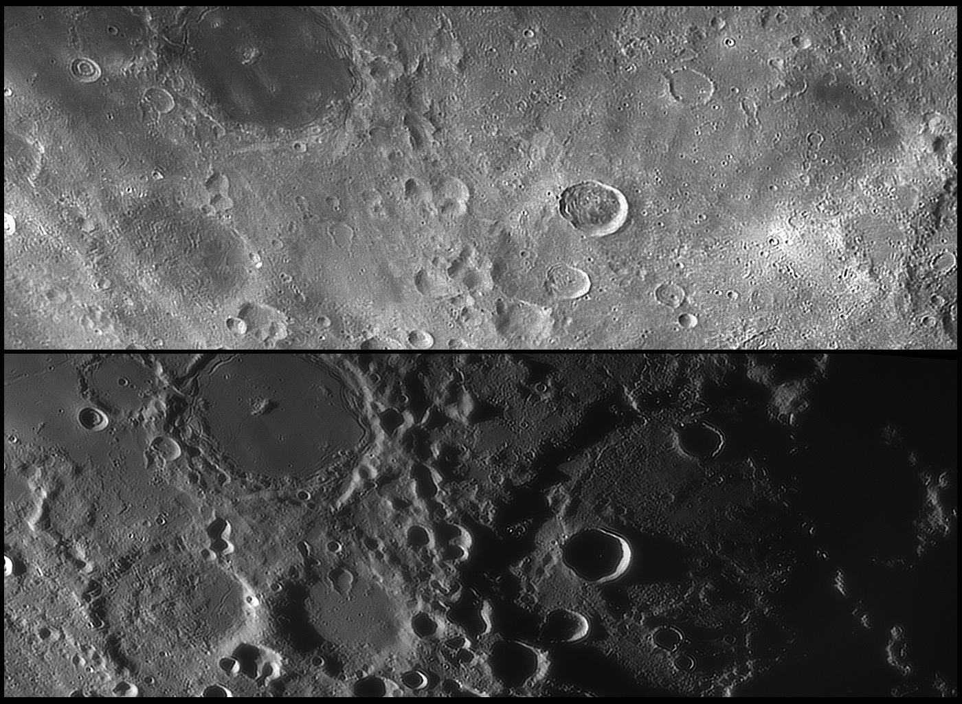 Intr-una din noptile ulterioare acestei sesiuni (27 Oct) am reusit sa mai achizitionez un set de imagini lunare, unele formatiuni fiind surprinse si in mini-mozaicul de pe 24 Octombrie. O astfel de comparatie a aspectului craterelor Hesiodus, Pitatus, Deslandres in cele doua nopti: