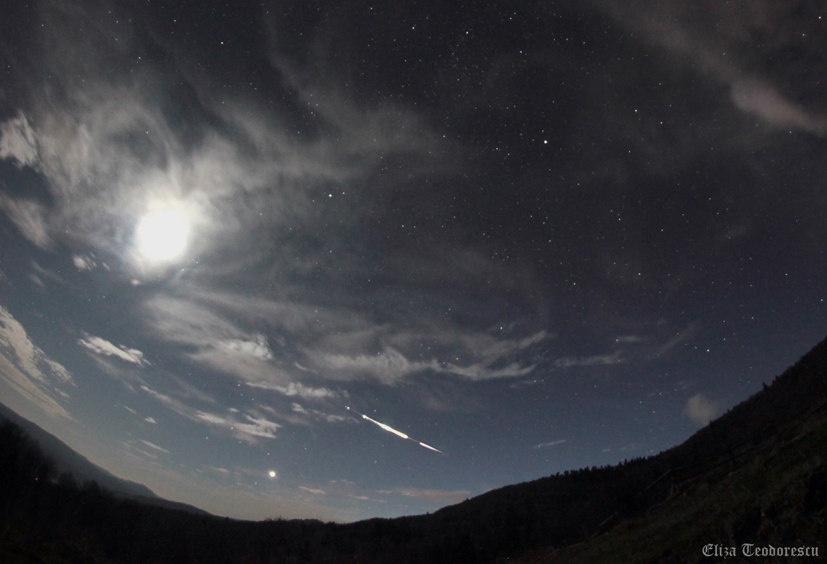 In timpul achizitiei cadrelor pentru imaginile de mai sus, sotia mea avea montat aparatul cu un obiectiv fish-eye de 8mm pe un trepied. Norocul a facut ca in timpul achizitiei unui time-lapse sa surprinda ceea ce ne-a lasat pe toti cu gurile cascate pentru mai bine de 10 secunde: un bolid de magnitudine -5.5 !